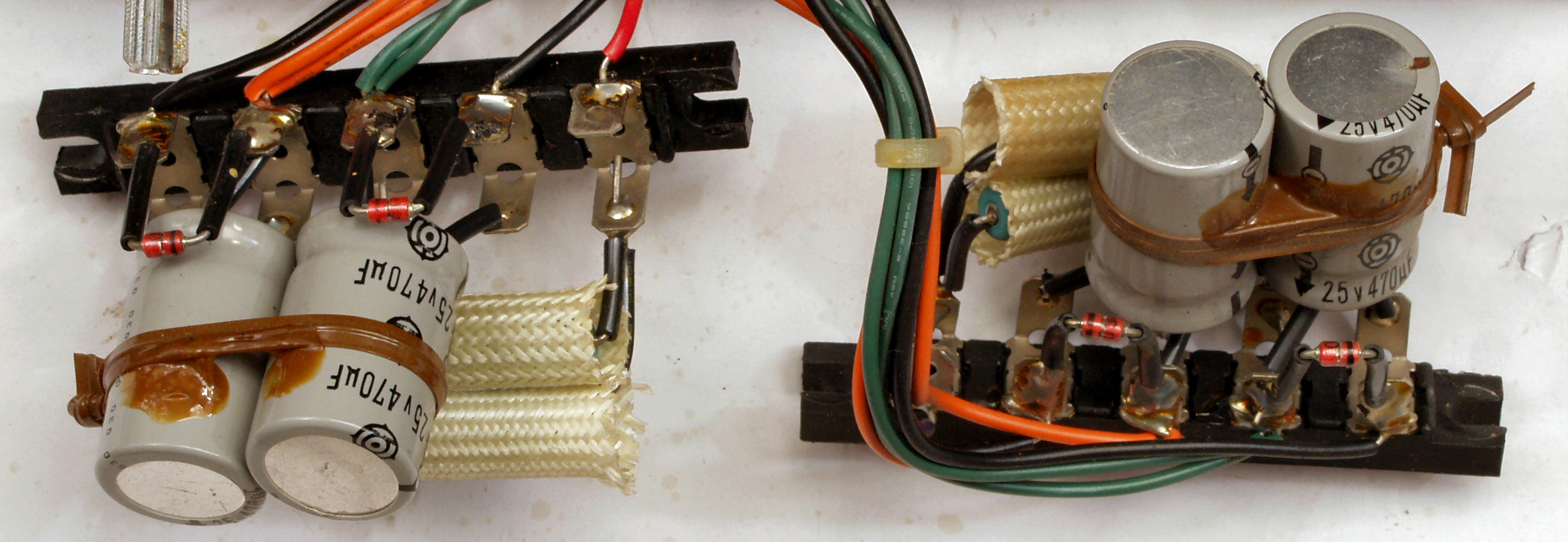 | A62. 点検中 交換する電解コンデンサー。 左=付いている物 470μ/80V、 右=交換する物 330μ/100V×2=660μ、 |