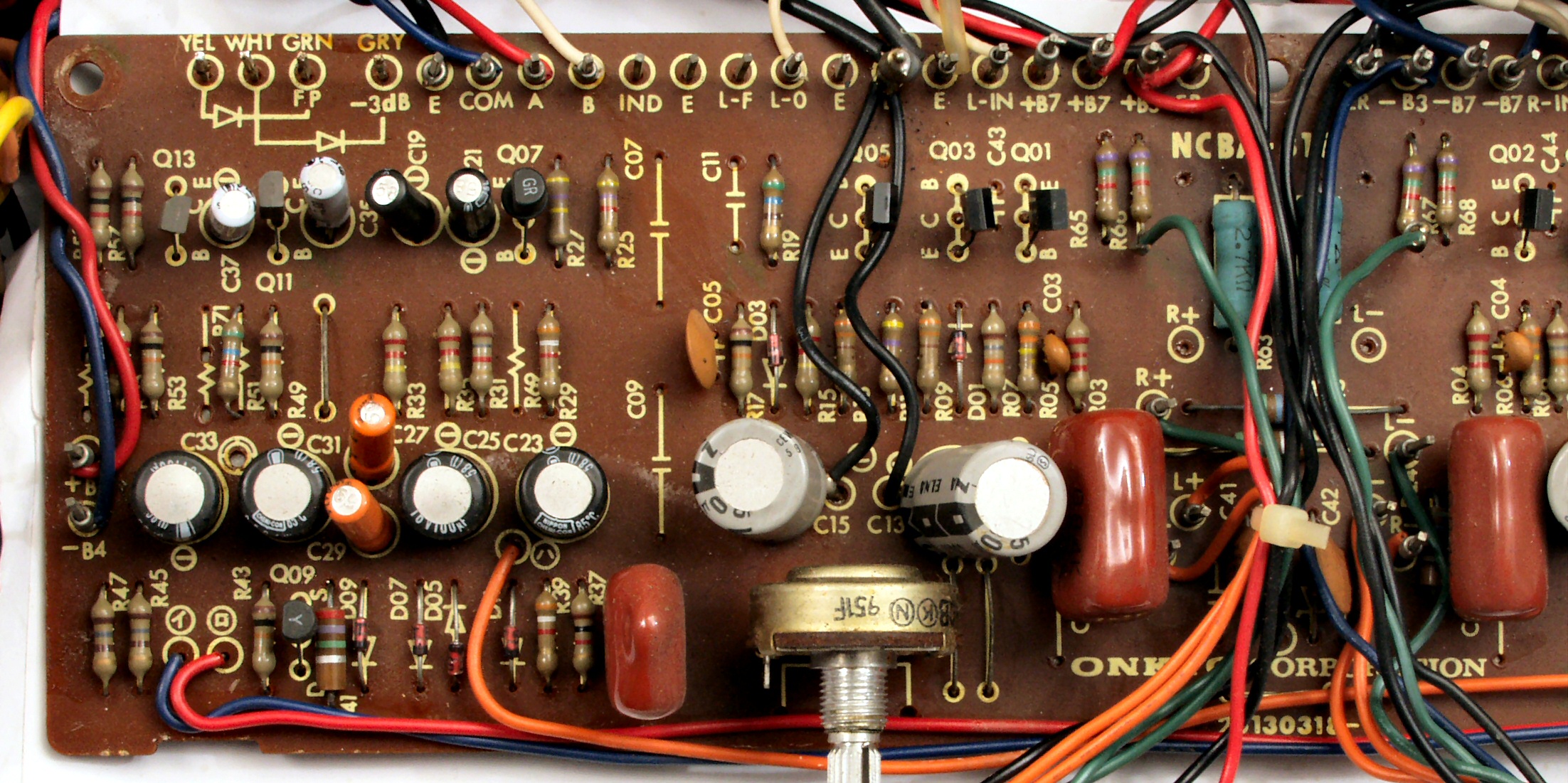 | C42. 修理後 プリAMP・ピークモニター基板 TR(トランジスター)6個、電解コンデンサー24個、フイルムコンデンサー4個交換 |