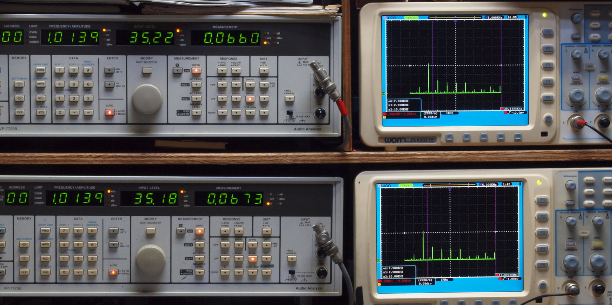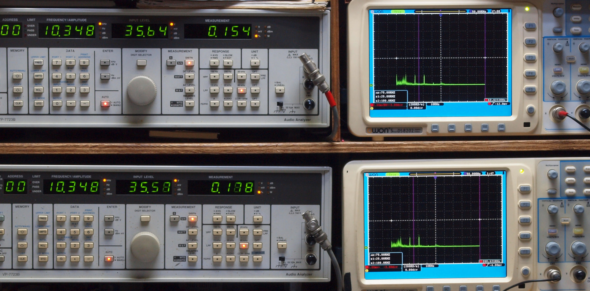 上段右端 VP−7723Bの基本波除去出力を「owon SDS8202(200MHZ)」で「FFT分析」表示。