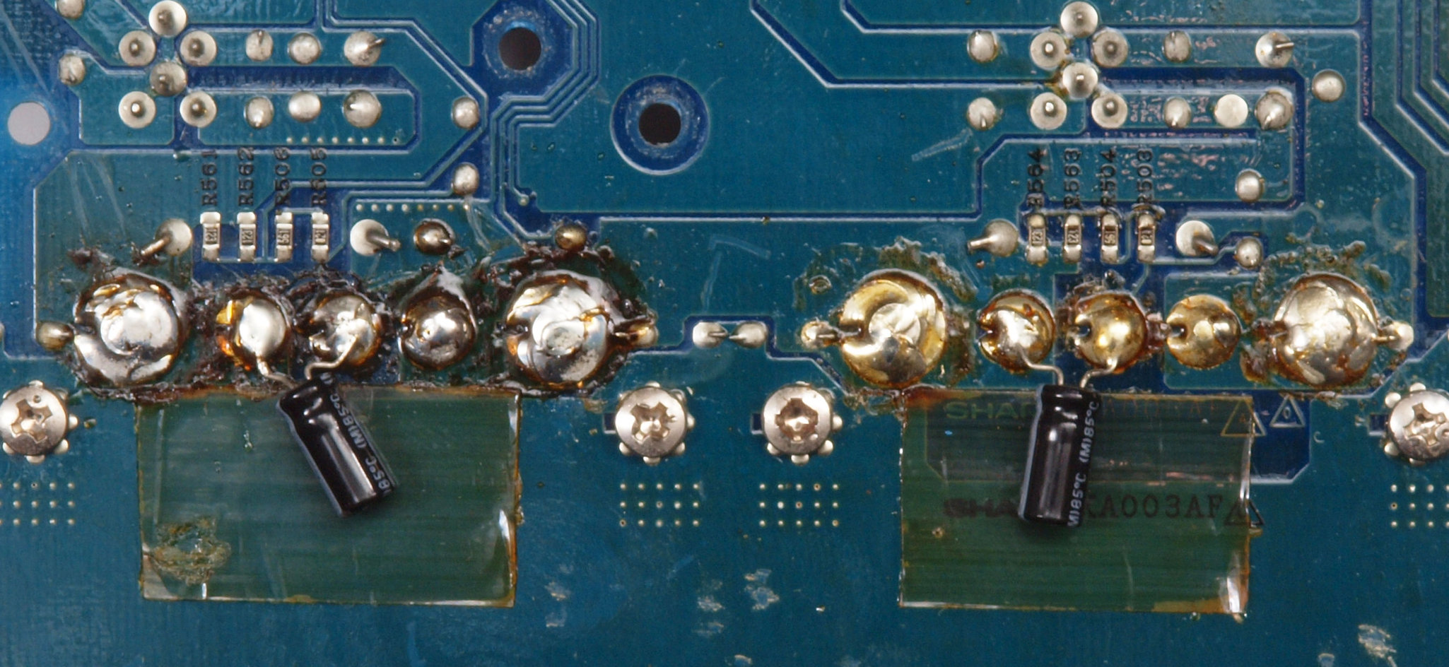 C35. 修理中 DC−DCコンバーター基板裏。DC−DCコンバーターの出力端子半田。