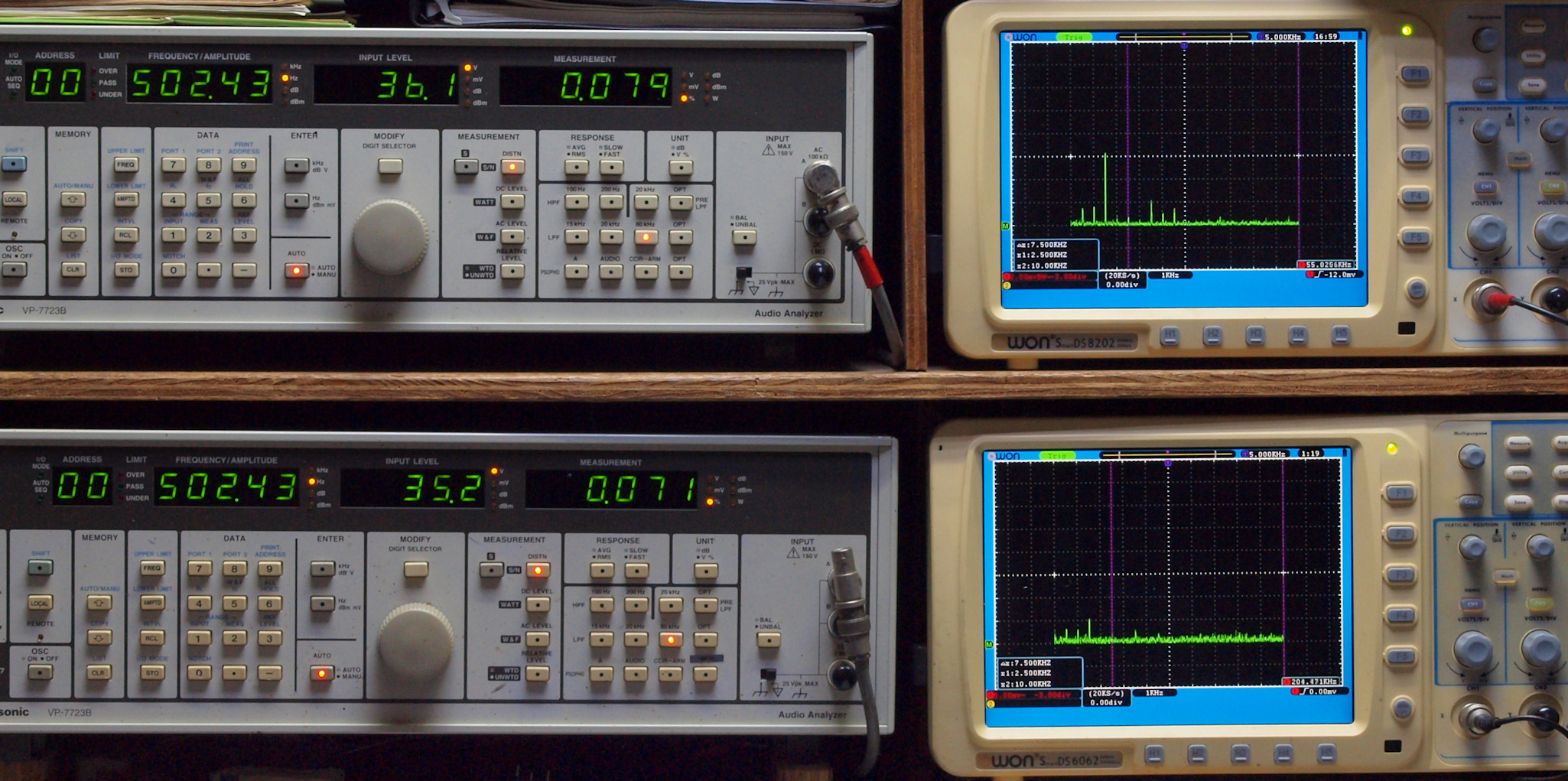 上段右端 VP−7723Bの基本波除去出力を「owon SDS8202(200MHZ)」で「FFT分析」表示。