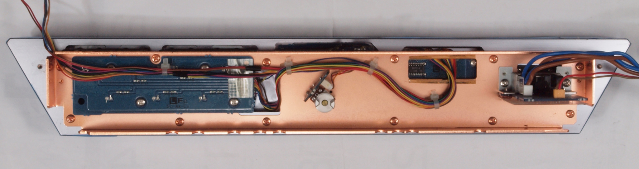 | C. 修理状況。 画像をクリックすると、大きく(横幅2050ドット)表示されます。 C0. 修理中 部品・基板を取り去ったシャーシ裏。埃が入っている。 |