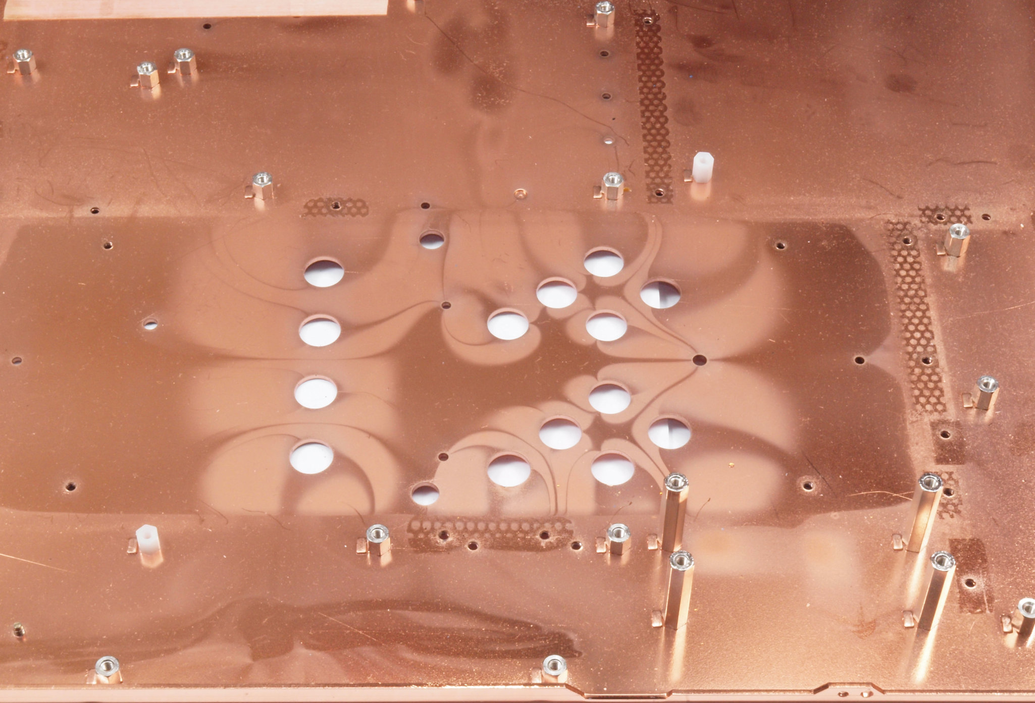 | C01. 修理中 部品・基板を取り去ったシャーシ裏。清掃後CRCで拭く。 |