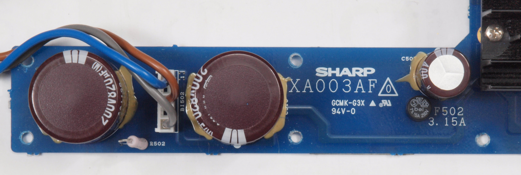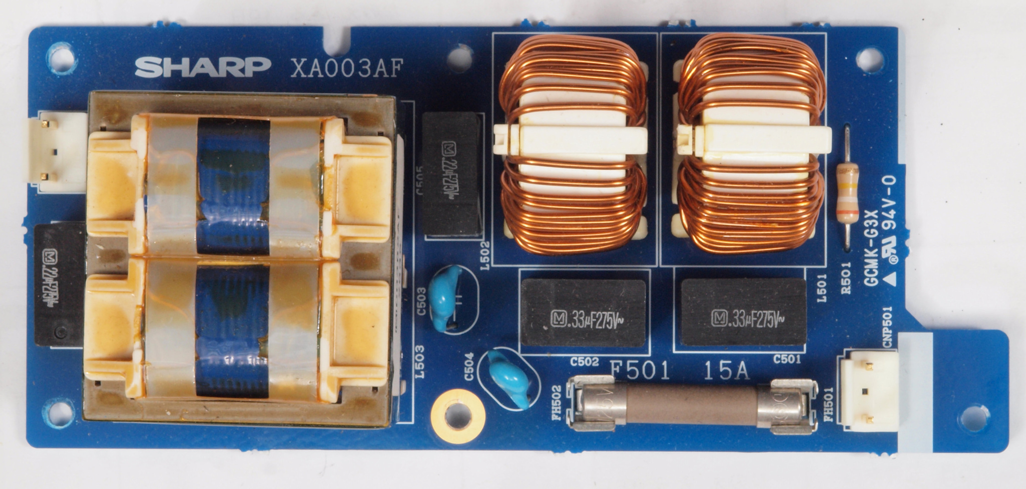 | C51. 修理中 電源フイルター基板。 電源ヒューズは15A、 100V×15A=1.5KVA。 |