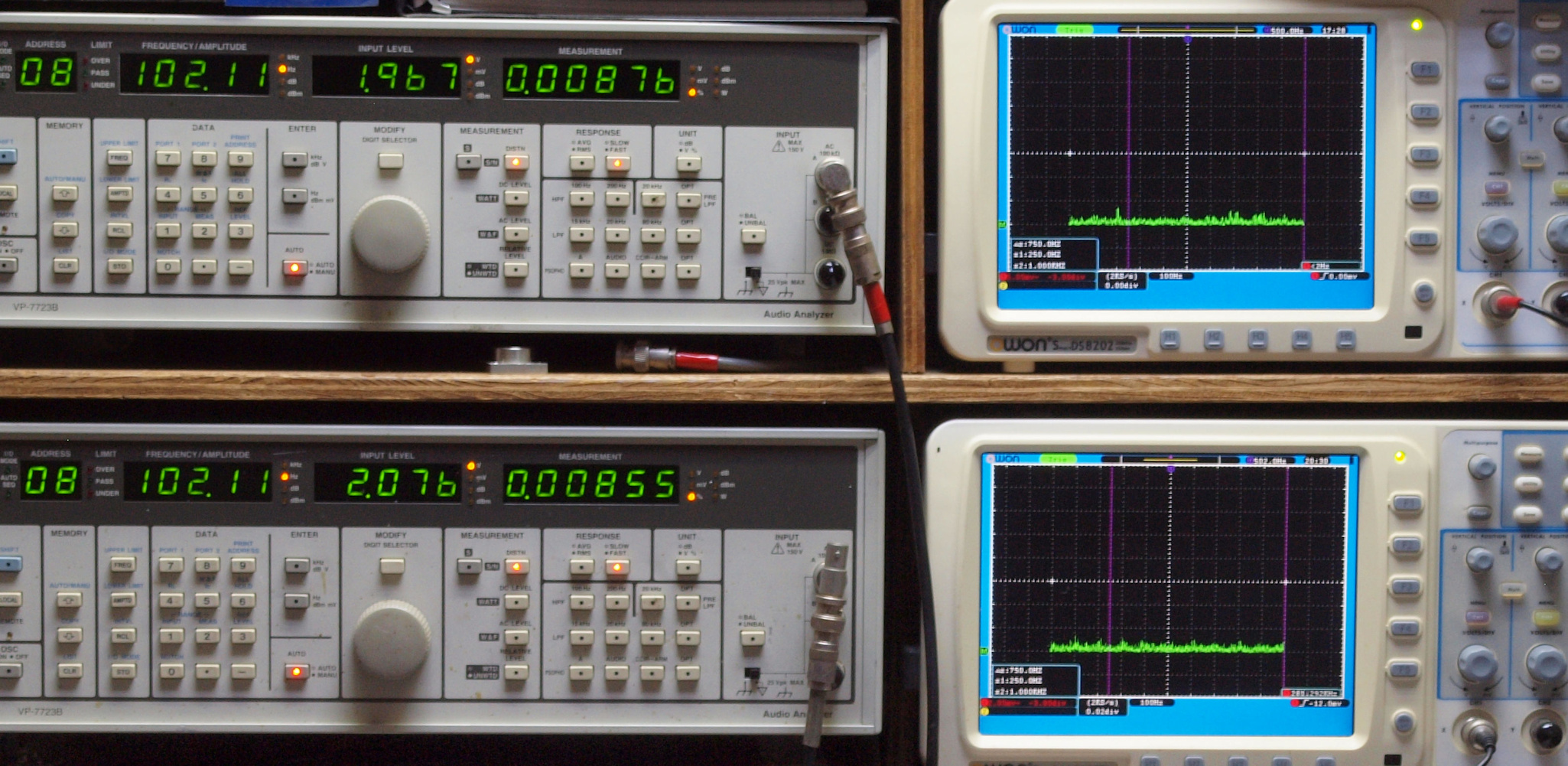 | E. 調整・測定。 画像をクリックすると、大きく(横幅2050ドット)表示されます。 E0. 出力・歪み率測定・調整。 「見方」。 上段中 右側SP出力を「Audio Analyzer Panasonic VP−7723B」により測定。 表示LED、 左端=メモリーNo、 中左=周波数測定、 中右=出力電圧測定、 右端=歪み率測定。 上段右端 VP−7723Bの基本波除去出力を「owon SDS8202(200MHZ)」で「FFT分析」表示。 下段中 左側SP出力を「Audio Analyzer Panasonic VP−7723B」により測定。 表示LED、 左端=メモリーNo、 中左=周波数測定、 中右=出力電圧測定、 右端=歪み率測定。 下段右端 VP−7723Bの基本波除去出力を「owon SDS6062(200MHZ)」で「FFT分析」表示。 下段左端 オーディオ発振器 VP−7201A より50Hz〜100kHzの信号を出し(歪み率=約0.003%)、ATT+分配器を通し、AMPに入力。 よって、ダイアル設定出力レベルより低くなります。測定機器の仕様や整備の様子はこちら、「VP−7723B」「VP−7201A」。 FFT画面の見方はこちら。 |