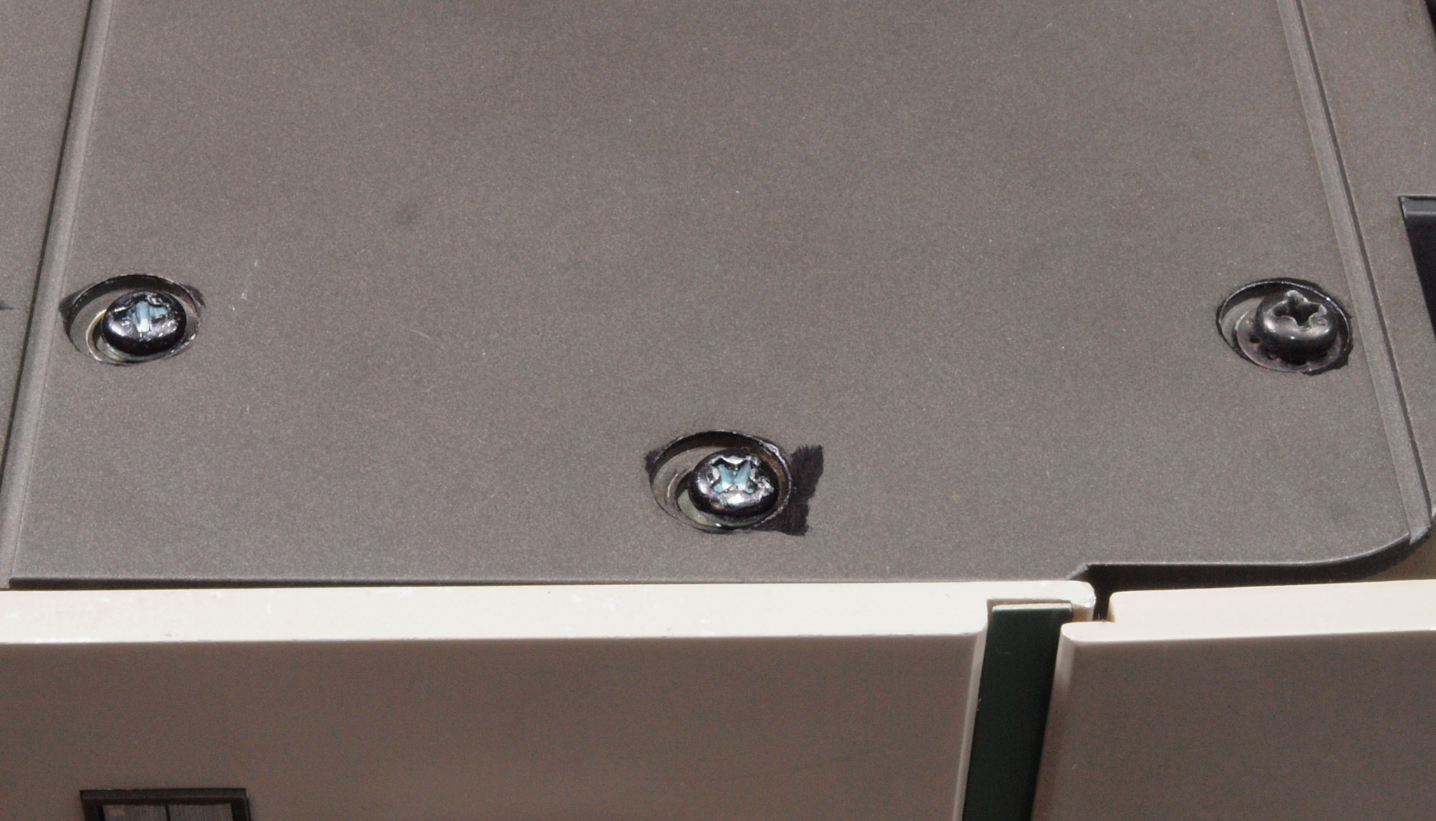 | CD1. 修理前 右横パネル止めビス。ラック・マウント・アングルを取り外した時、紛失したのでしょう? | ||||||||||||||||||||||||||||||||||||||||