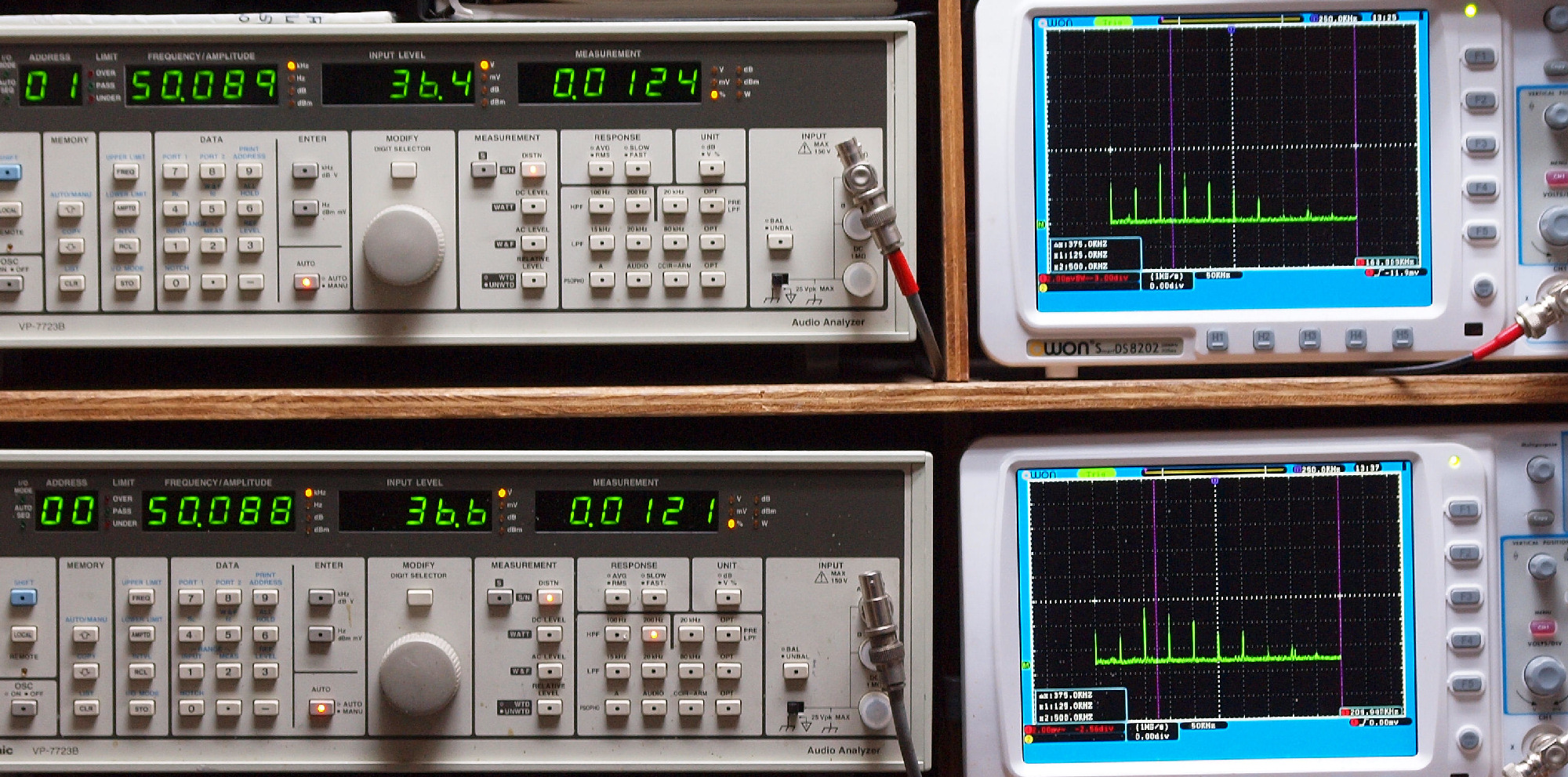 | E. 測定・調整 E1. 出力・歪み率測定・調整 「見方」。 上段中 右側SP出力を「Audio Analyzer Panasonic VP−7723B」により測定。 表示LED、 左端=メモリーNo、 中左=周波数測定、 中右=出力電圧測定、 右端=歪み率測定。 上段右端 VP−7723Bの基本波除去出力を「owon SDS8202(200MHZ)」で「FFT分析」表示。 下段中 左側SP出力を「Audio Analyzer Panasonic VP−7723B」により測定。 表示LED、 左端=メモリーNo、 中左=周波数測定、 中右=出力電圧測定、 右端=歪み率測定。 下段右端 VP−7723Bの基本波除去出力を「owon SDS6062(200MHZ)」で「FFT分析」表示。 下段左端 オーディオ発振器 VP−7201A より50Hz〜100kHzの信号を出し(歪み率=約0.003%)、ATT+分配器を通し、AMPに入力。 よって、ダイアル設定出力レベルより低くなります。測定機器の仕様や整備の様子はこちら、「VP−7723B」「VP−7201A」。 FFT画面の見方はこちら。 |