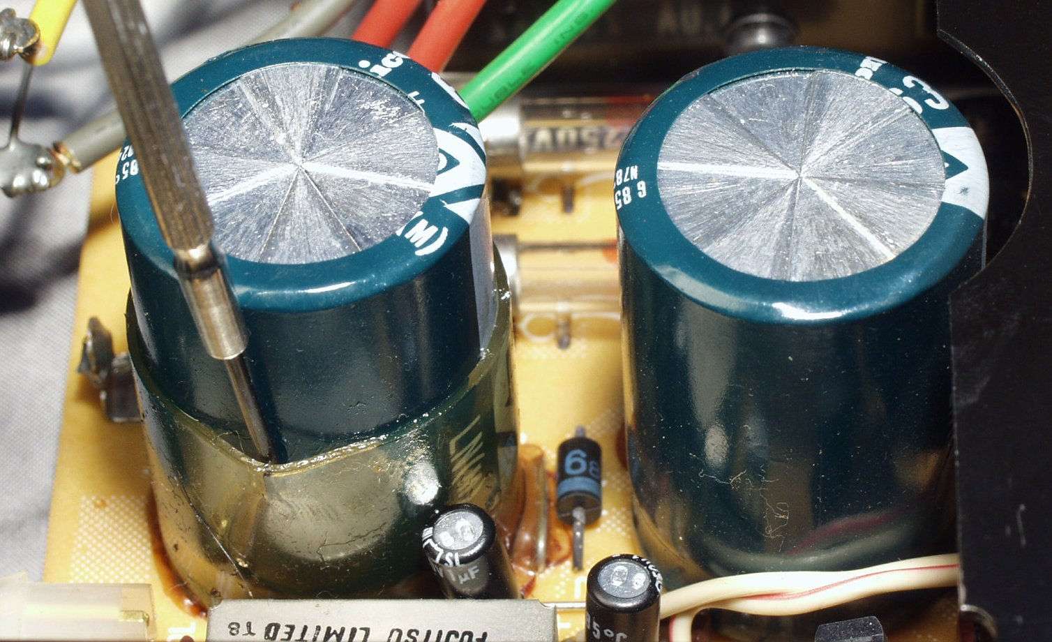 | A−4. 修理前 電解コンデンサーが液漏れ? 「ベタベタ」している |