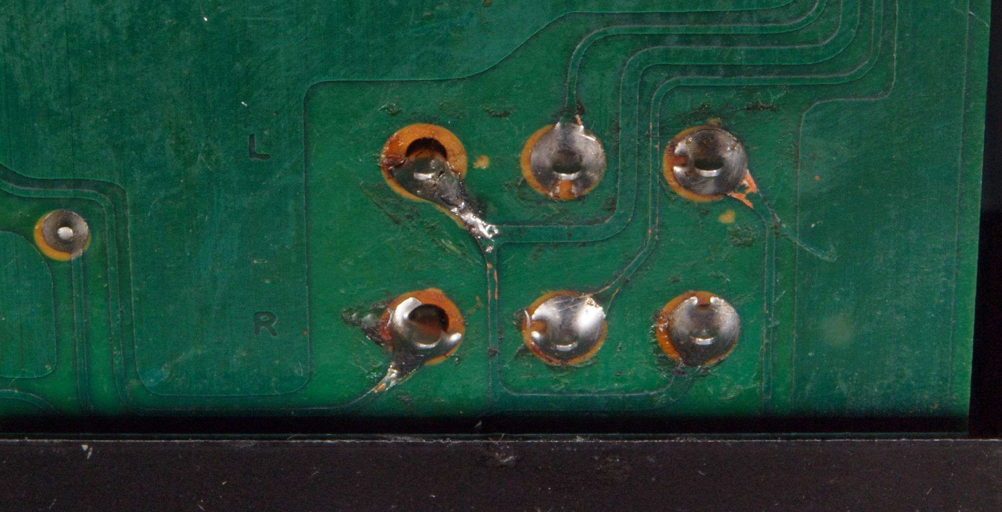 | B−2。 入力RCA端子基板裏。半田屑が2個残されている、今にも落ちそう。 | |