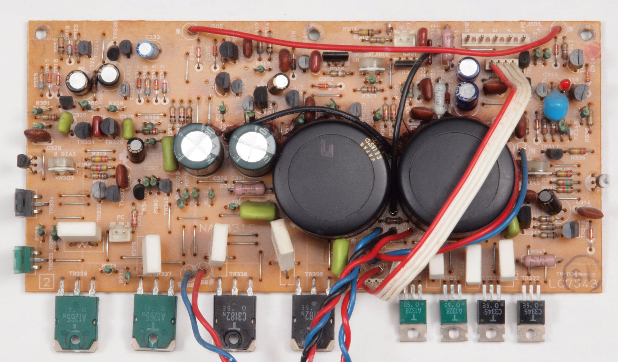 | A−2000。 左右で終段TR(トランジスター)のメーカーが異なる。 R側サンケン製、 L側東芝製。 |