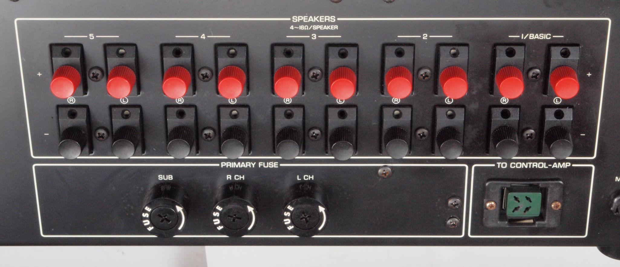 スピーカー切換部 5組のスピーカー切換SWと左右独立レベルコントロールボリューム