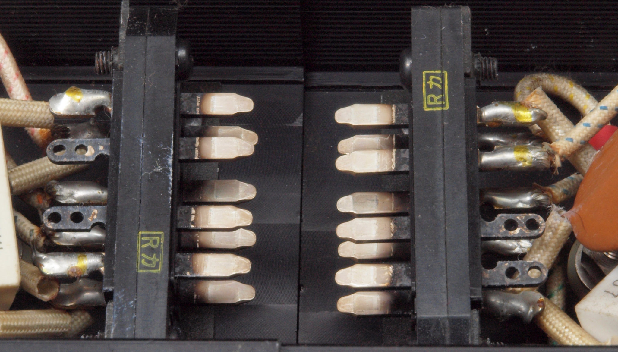 | C97. 修理(清掃)後 右側終段出力SIT静電誘導型トランジスター2SK77トランジスター足。 左=側+、右=−側。 | ||||||||||||||||||||||||||||||||||||||||||||||||||||