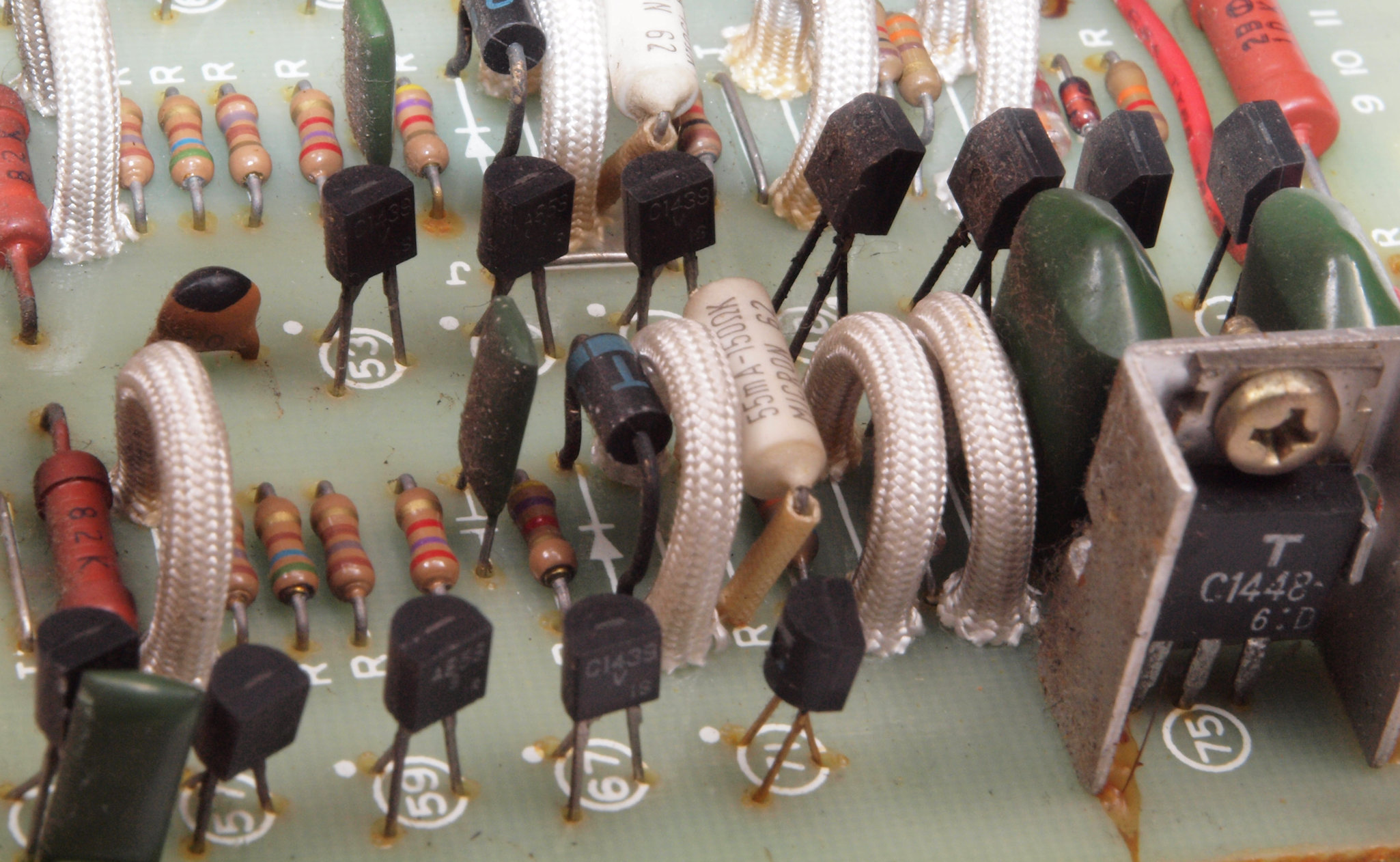 | C412. 修理中 電源1基板。電解コンデンサー固定用の接着材、当時は溶媒にトルエンが使用されており、銅を腐食する。 焼損保護を被した抵抗を外して点検。 | ||||||||||||||||||||||||||||||||||||||||||||||||||||