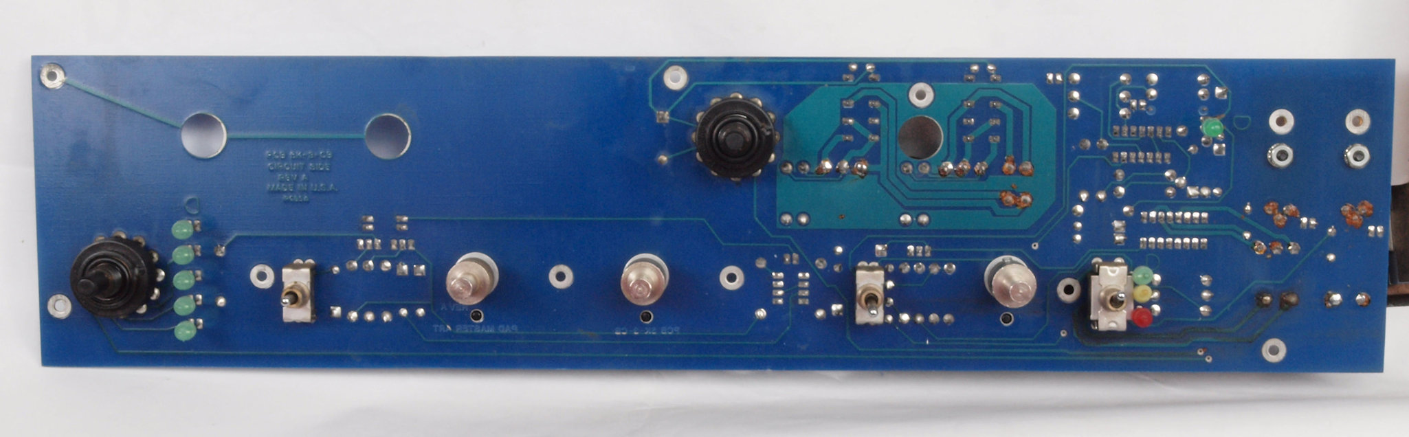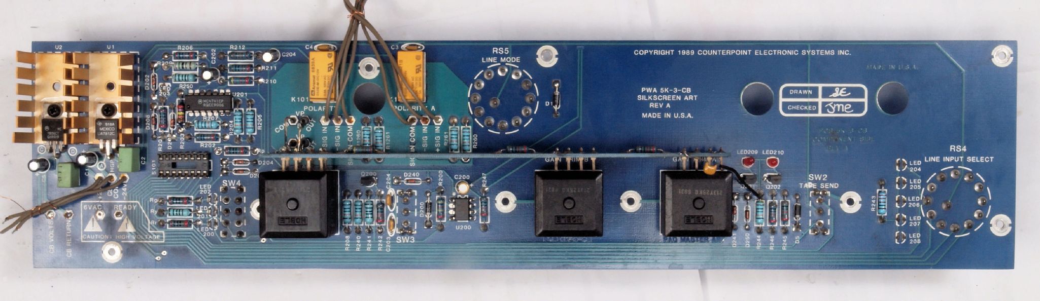 | C62. 修理(半田補正含)後 前パネル基板。 リレー2個、電解コンデンサー4個交換。 メインVR、アムトランス APAT3250M50K 32NEG(スクアラン仕様) 2個交換。 | ||||||||||||||||||||||||||||||||||||||