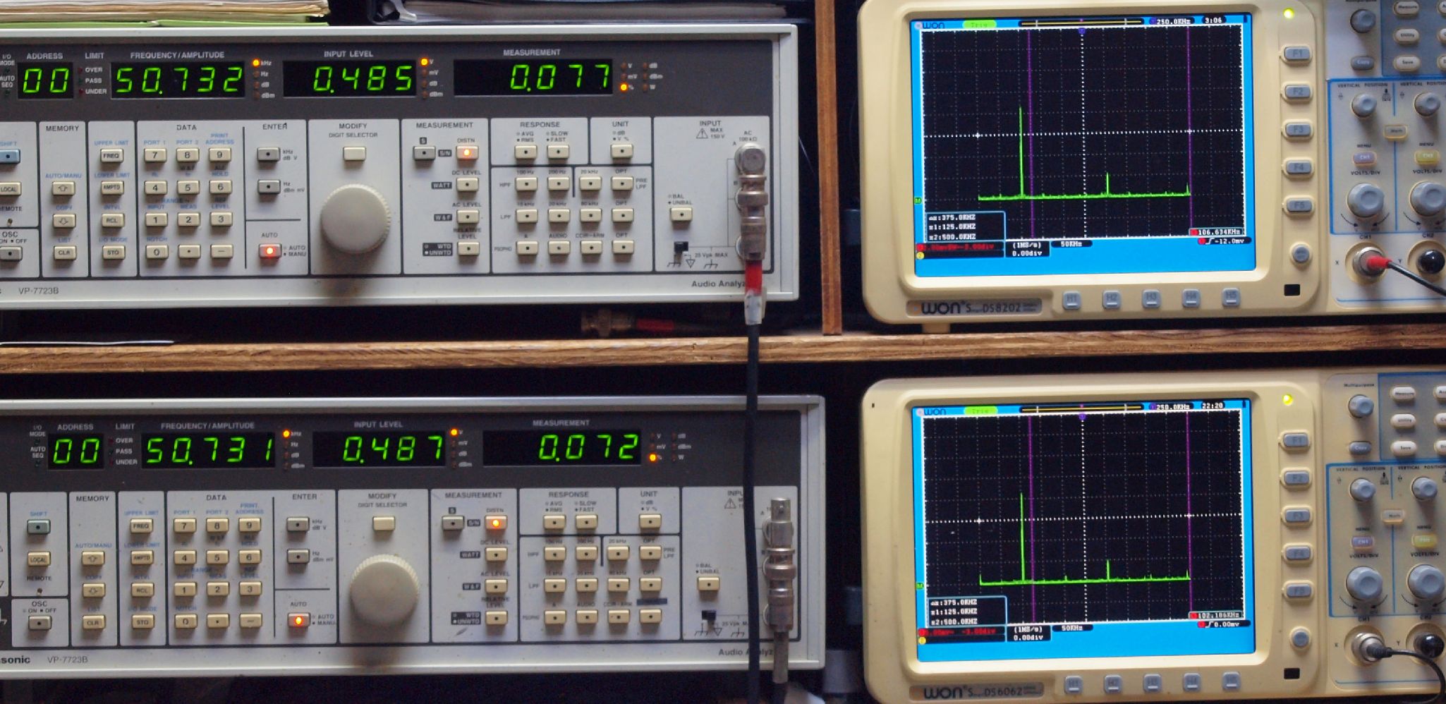 | E. 調整・測定。 画像をクリックすると、大きく(横幅2050ドット)表示されます。 E0. 出力・歪み率測定・調整。 仕様から1V出力で測定。低域に設計があるので、20Hz測定追加。 「見方」。 上段中 右側SP出力を「Audio Analyzer Panasonic VP−7723B」により測定。 表示LED、 左端=メモリーNo、 中左=周波数測定、 中右=出力電圧測定、 右端=歪み率測定。 上段右端 VP−7723Bの基本波除去出力を「owon SDS8202(200MHZ)」で「FFT分析」表示。 下段中 左側SP出力を「Audio Analyzer Panasonic VP−7723B」により測定。 表示LED、 左端=メモリーNo、 中左=周波数測定、 中右=出力電圧測定、 右端=歪み率測定。 下段右端 VP−7723Bの基本波除去出力を「owon SDS6062(200MHZ)」で「FFT分析」表示。 下段左端 オーディオ発振器 VP−7201A より50Hz〜100kHzの信号を出し(歪み率=約0.003%)、ATT+分配器を通し、AMPに入力。 よって、ダイアル設定出力レベルより低くなります。測定機器の仕様や整備の様子はこちら、「VP−7723B」「VP−7201A」。 FFT画面の見方はこちら。 |