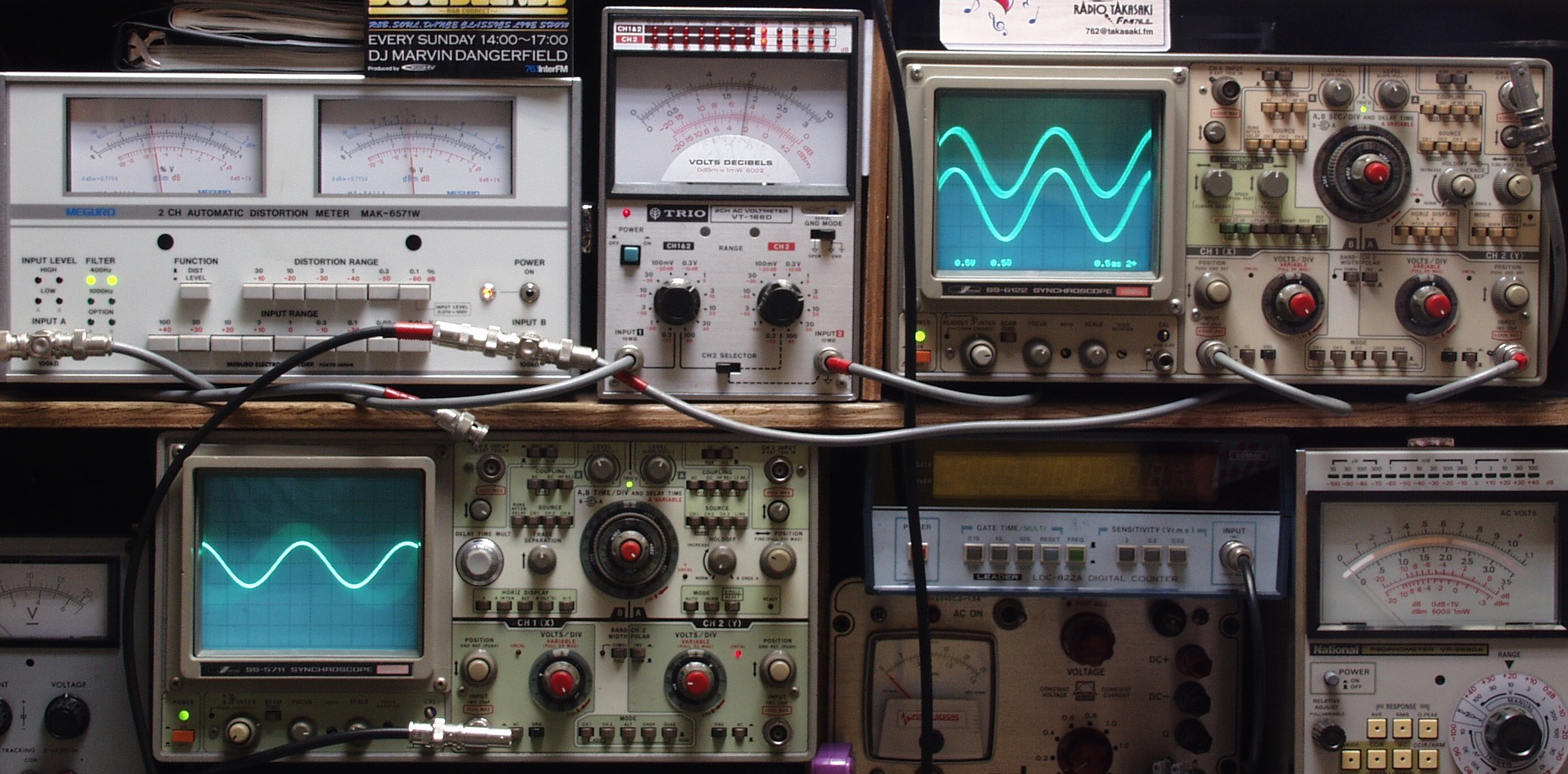 | E. 調整・測定 E1.調整・出力測定 <見方> 上左オーデオ発振器より400HZ・1KHZの信号を出す(歪み率=約0.003%) 下中=入力波形(オーデオ発振器のTTLレベル) 下右=周波数計 上左=SP出力の歪み率測定 左メ−タ−=L出力、右メ−タ−=R出力 上中=SP出力電圧測定器、赤針=R出力、黒針=L出力 上右=SP出力波形オシロ 上=R出力、下=L出力(出力電圧測定器の出力) |