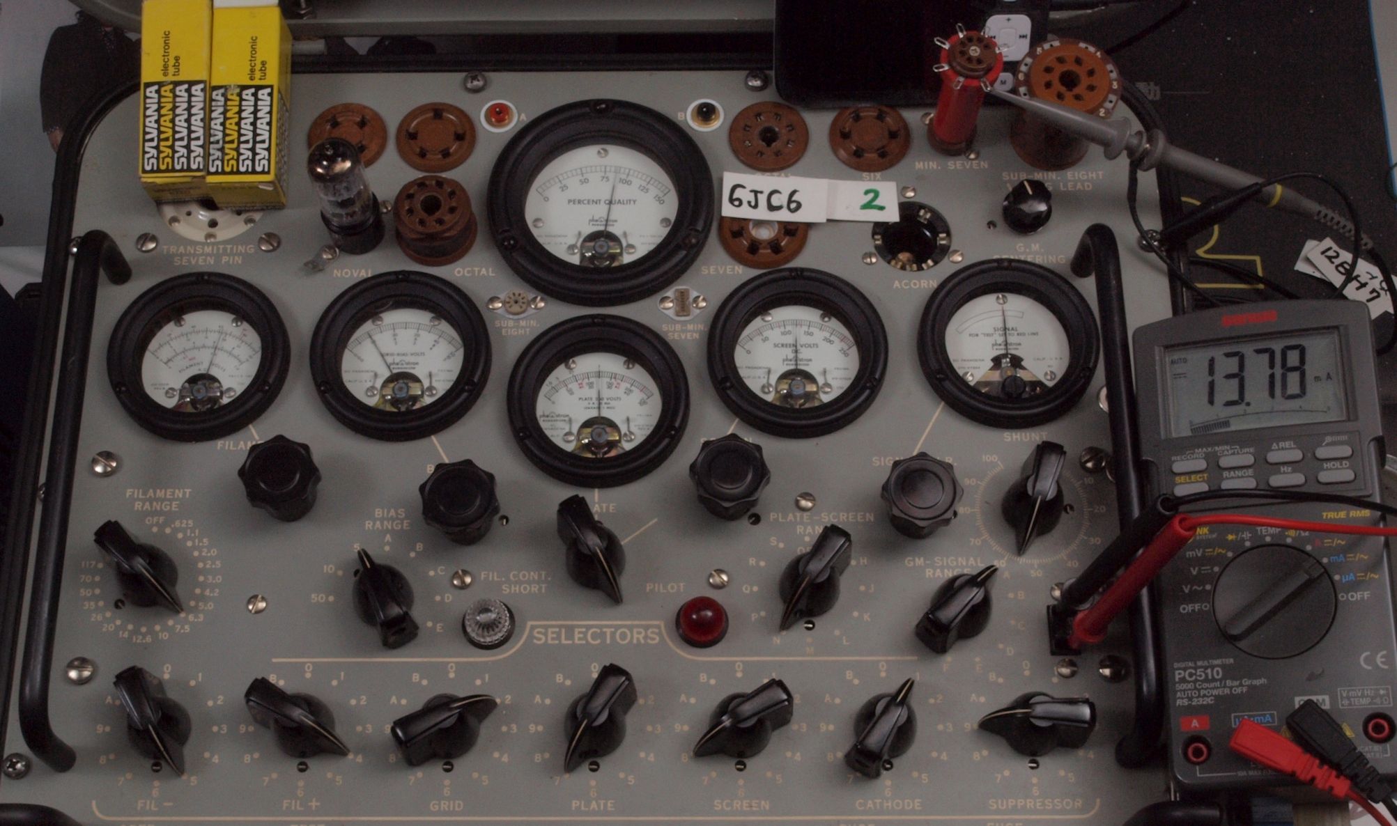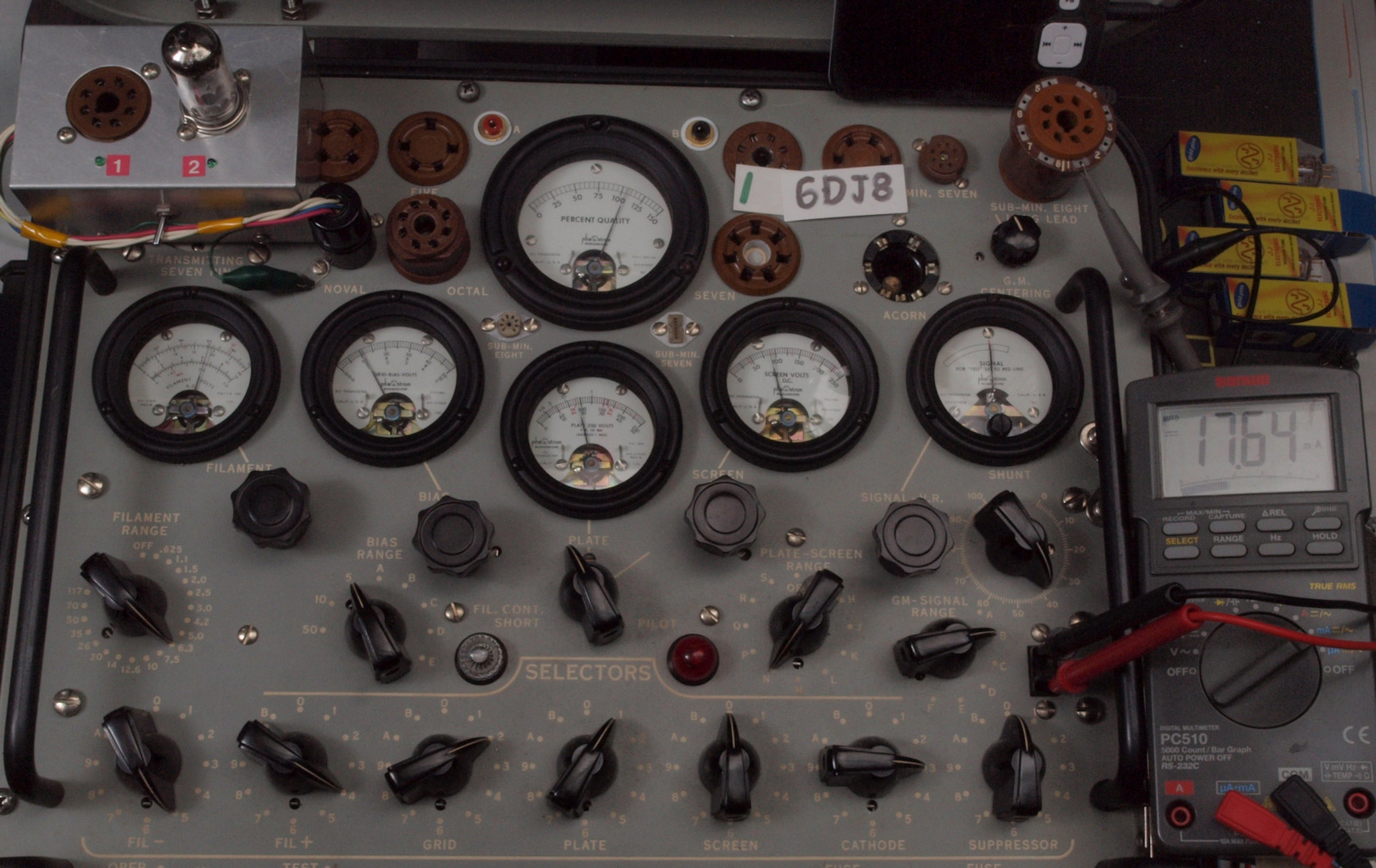 | U11. 付属1本目 6DJ8 ユニット1。 Gm測定=10500μmho、 Ip=17.64mA。 測定条件、「Ep=90V、Eg1=−1.3V」、Aレンジ=30000μmhoでの測定。 相互コンダクタンス=12250μmho「Ep=90V、Ip=15mA、eg1=−1.3V」 1960/1962ナショナル真空管ハンドブック、全日本真空管マニュアル、オーディオ用真空管マニアル、69'東芝電子管ハンドブック、RC-30 Receiving Tube Manualより。 |