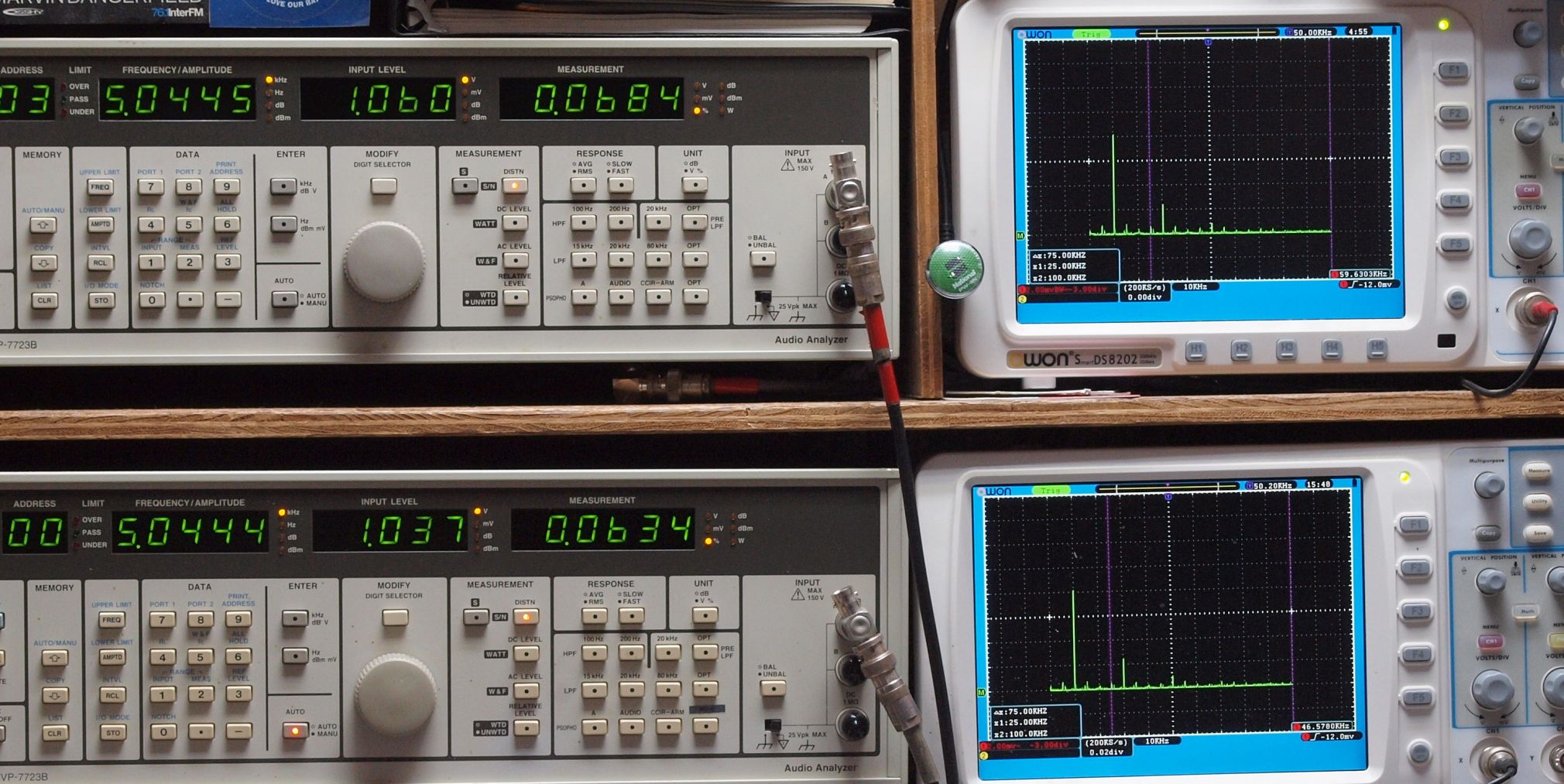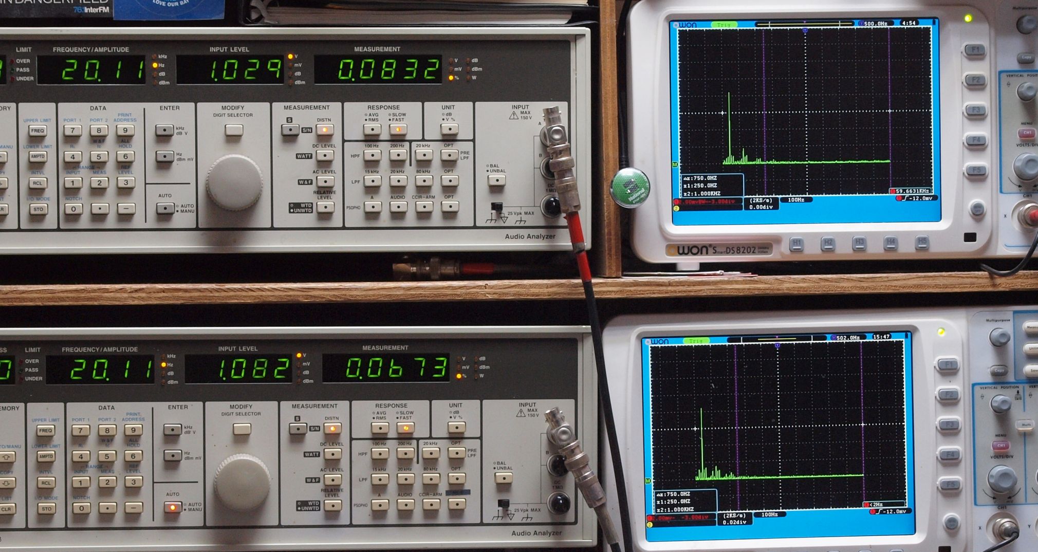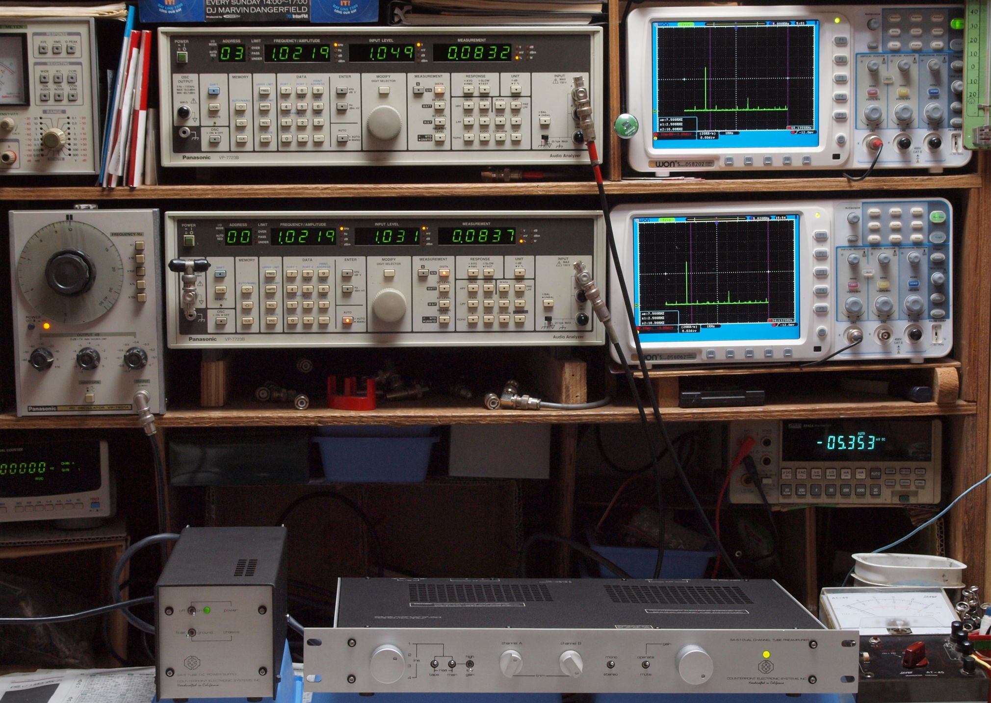 | E. 調整・測定。 画像をクリックすると、大きく(横幅2050ドット)表示されます。 E0. 出力・歪み率測定・調整。 仕様から1V出力で測定。低域に設計があるので、20Hz測定追加。 「見方」。 上段中 右側SP出力を「Audio Analyzer Panasonic VP−7723B」により測定。 表示LED、 左端=メモリーNo、 中左=周波数測定、 中右=出力電圧測定、 右端=歪み率測定。 上段右端 VP−7723Bの基本波除去出力を「owon SDS8202(200MHZ)」で「FFT分析」表示。 下段中 左側SP出力を「Audio Analyzer Panasonic VP−7723B」により測定。 表示LED、 左端=メモリーNo、 中左=周波数測定、 中右=出力電圧測定、 右端=歪み率測定。 下段右端 VP−7723Bの基本波除去出力を「owon SDS6062(200MHZ)」で「FFT分析」表示。 下段左端 オーディオ発振器 VP−7201A より50Hz〜100kHzの信号を出し(歪み率=約0.003%)、ATT+分配器を通し、AMPに入力。 よって、ダイアル設定出力レベルより低くなります。測定機器の仕様や整備の様子はこちら、「VP−7723B」「VP−7201A」。 FFT画面の見方はこちら。 |