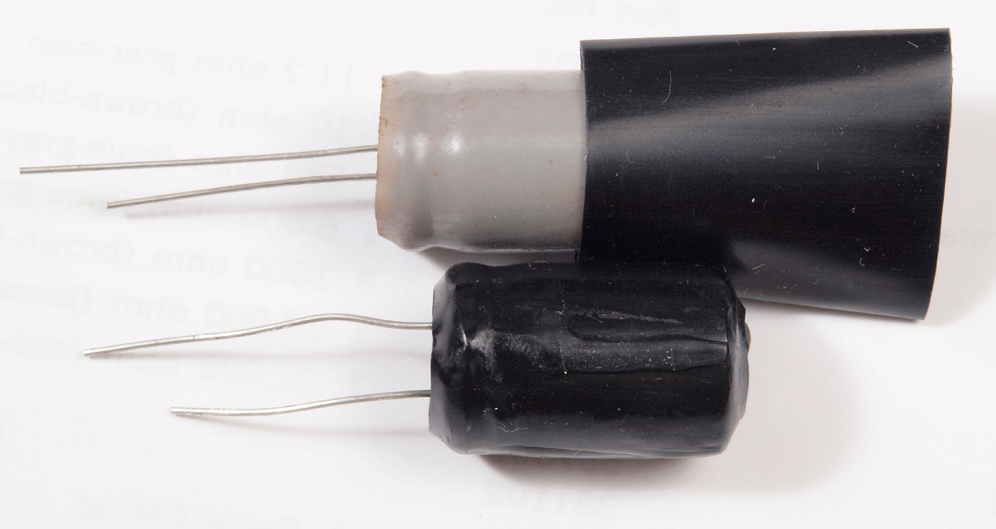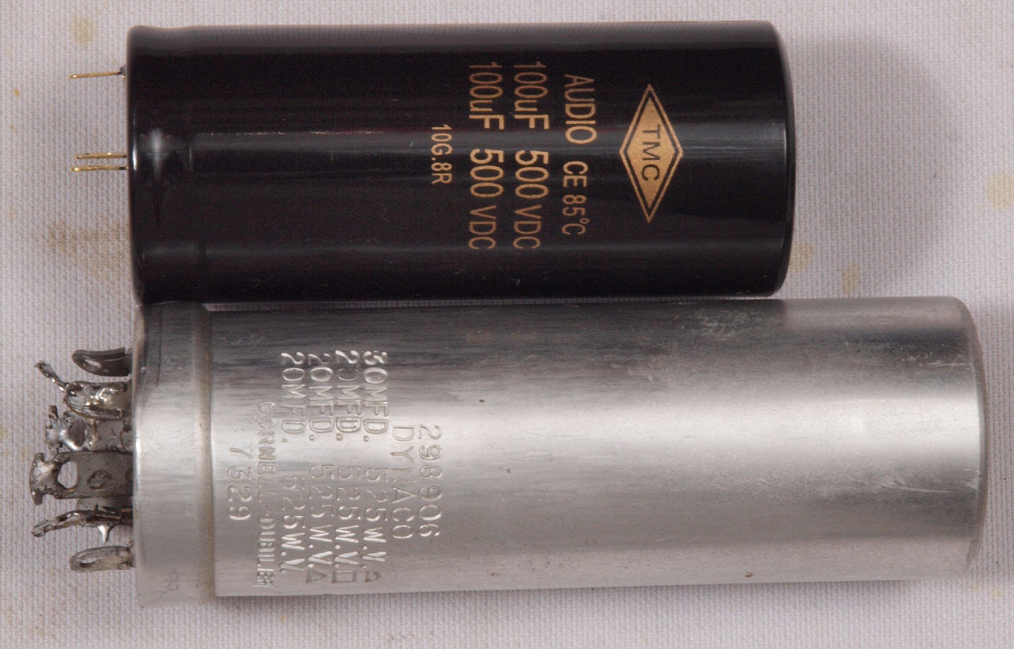 | C72. 交換部品、 電源ブロック電解コンデンサー。 上=交換した 100μ×2/500V、下=付いていた 30μ+20μ×3/525V。 |