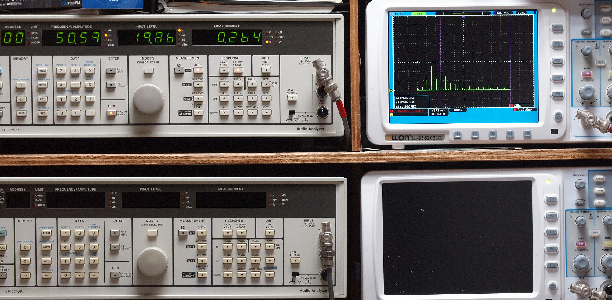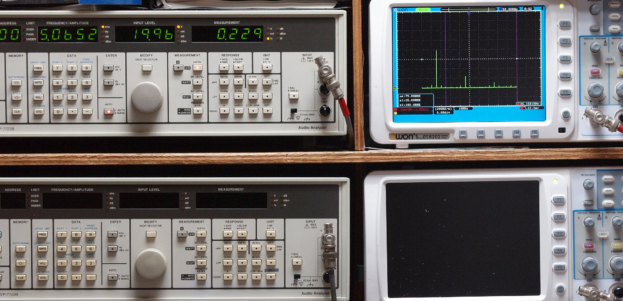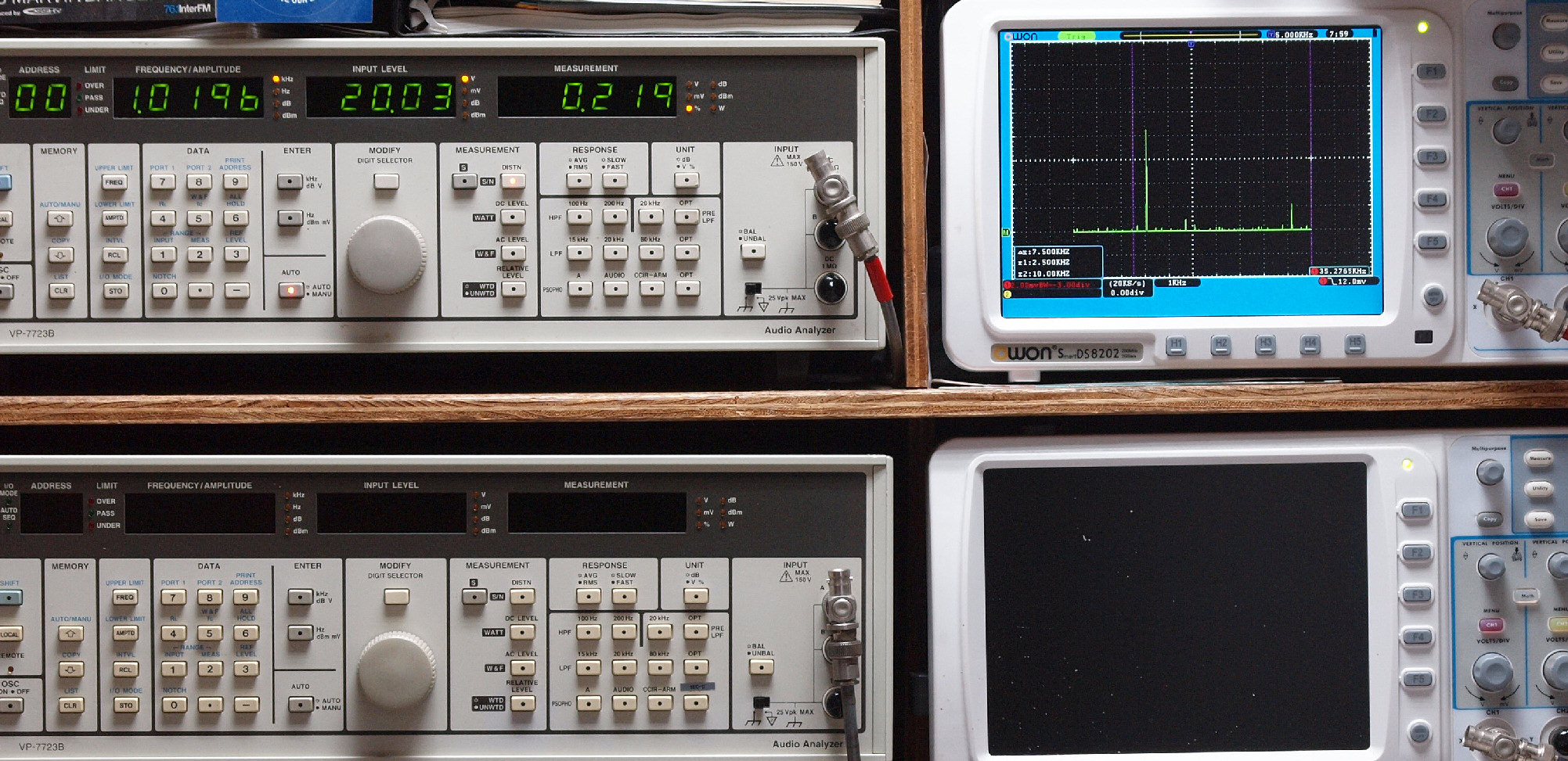 | E. 測定・調整。 画像をクリックすると、大きく(横幅2050ドット)表示されます。 E1. 出力・歪み率測定・調整 「見方」。 上段中 右側SP出力を「Audio Analyzer Panasonic VP−7723B」により測定。 表示LED、 左端=メモリーNo、 中左=周波数測定、 中右=出力電圧測定、 右端=歪み率測定。 上段右端 VP−7723Bの基本波除去出力を「owon SDS8202(200MHZ)」で「FFT分析」表示。 下段中 左側SP出力を「Audio Analyzer Panasonic VP−7723B」により測定。 表示LED、 左端=メモリーNo、 中左=周波数測定、 中右=出力電圧測定、 右端=歪み率測定。 下段右端 VP−7723Bの基本波除去出力を「owon SDS6062(200MHZ)」で「FFT分析」表示。 下段左端 オーディオ発振器 VP−7201A より50Hz〜100kHzの信号を出し(歪み率=約0.003%)、ATT+分配器を通し、AMPに入力。 よって、ダイアル設定出力レベルより低くなります。測定機器の仕様や整備の様子はこちら、「VP−7723B」「VP−7201A」。 FFT画面の見方はこちら。 |