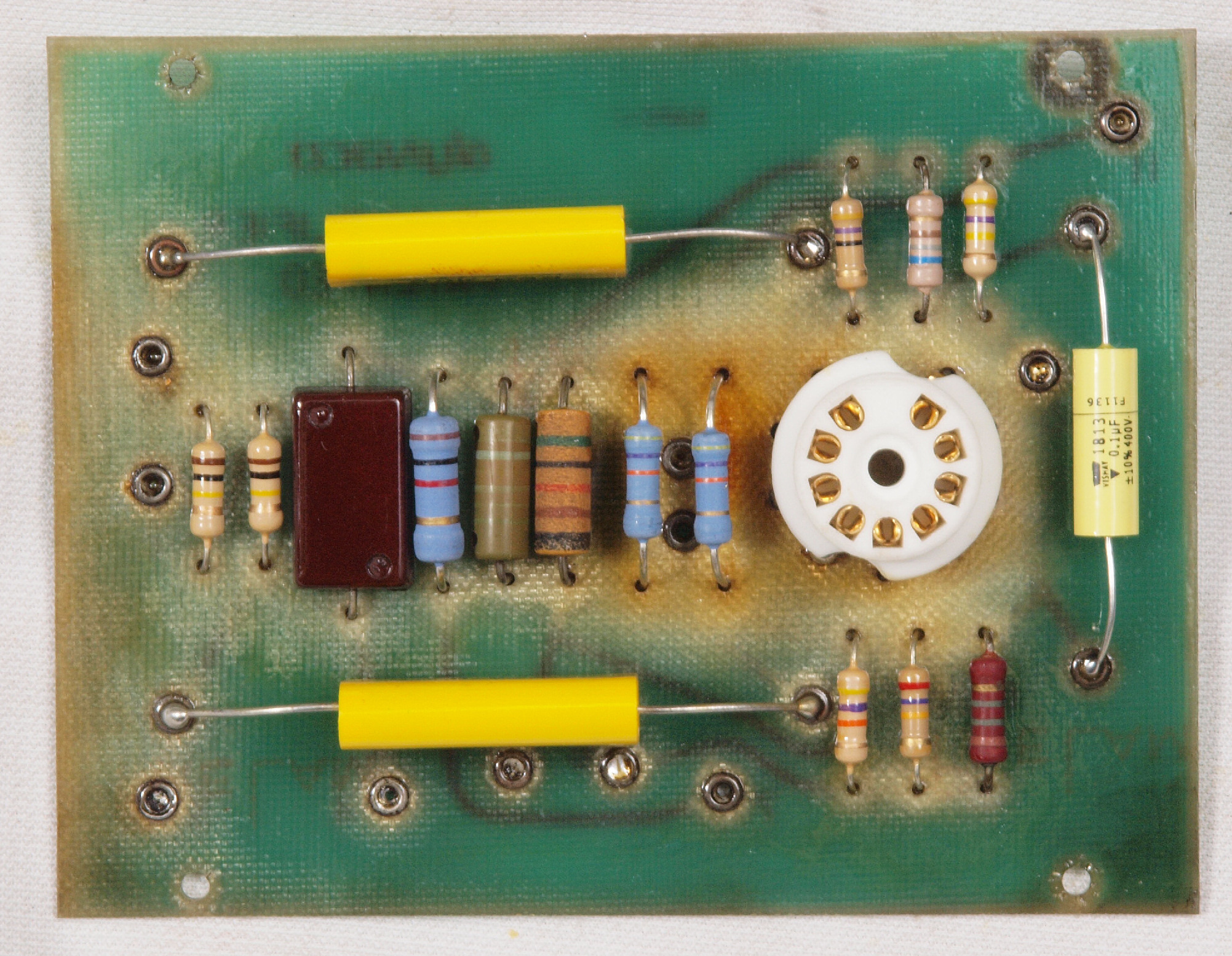 | C. 修理状況。 画像をクリックすると、大きく(横幅2050ドット)表示されます。 C11. 修理前 前段6AN8基板。 |