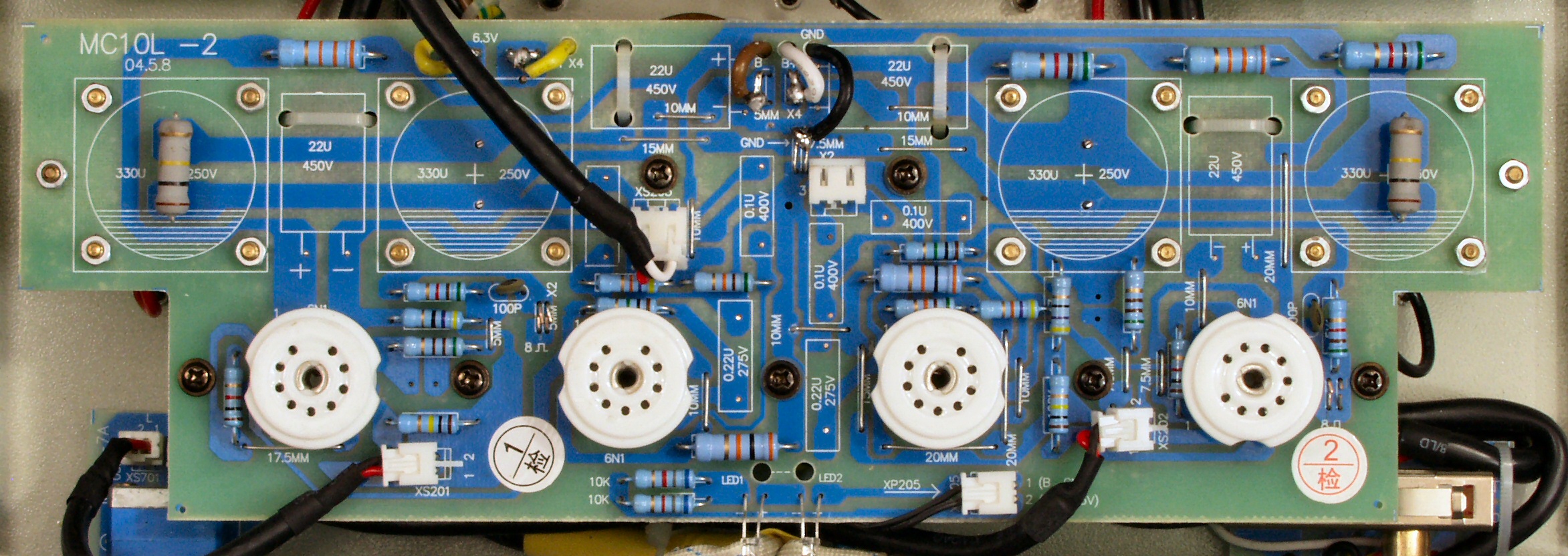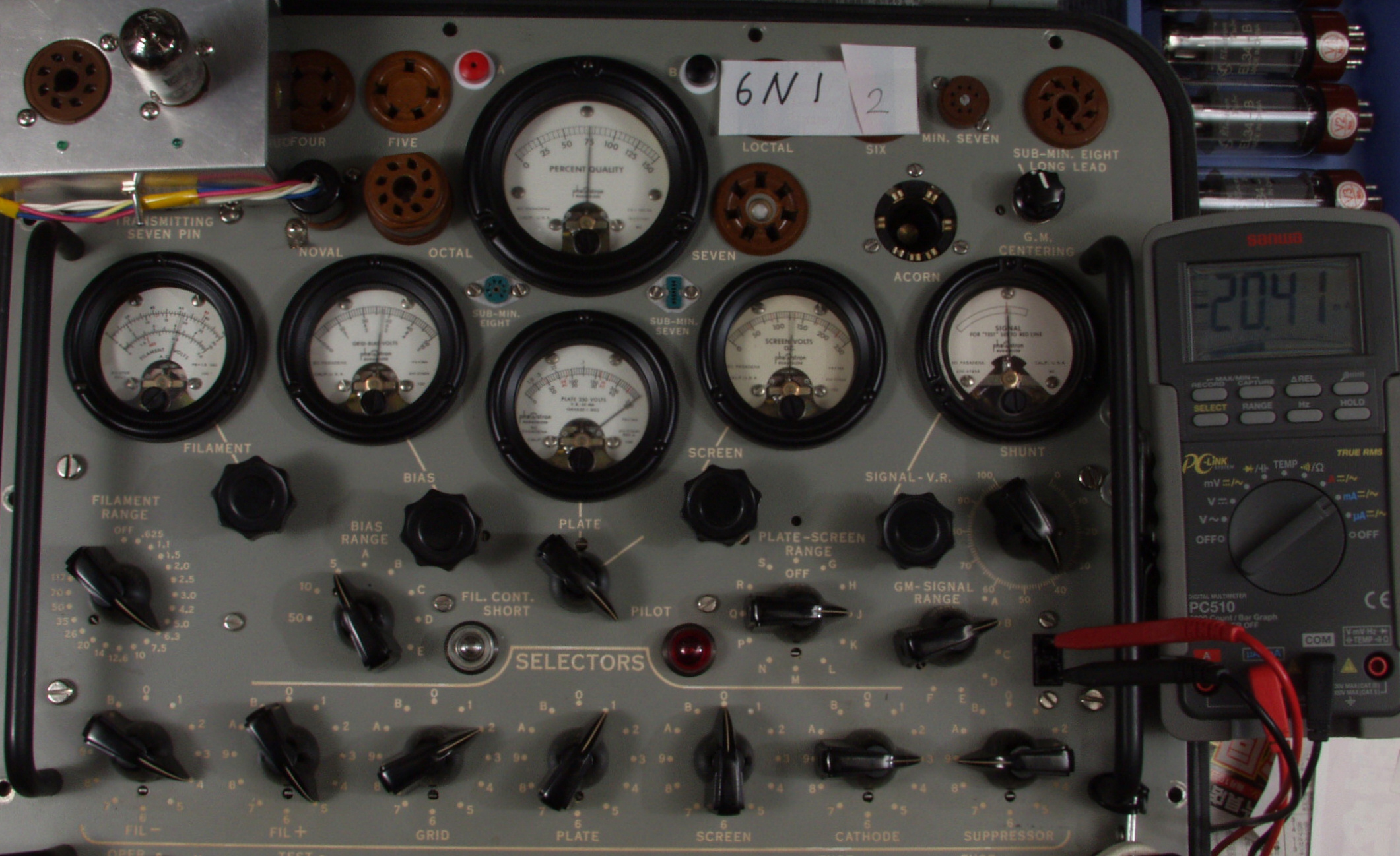 | 6N1付属1本目ユニット1。 Gm=6200μmho、IP=19.2mA。 ユニット2。 Gm=8300μmho、IP=24.9mA。 6N1付属2本目ユニット1。 Gm=7500μmho、IP=21.5mA。 ユニット2。 Gm=7500μmho、IP=20.4mA。 6N1付属3本目ユニット1。 Gm=7200μmho、IP=20.8mA。 ユニット2。 Gm=7500μmho、IP=21.3mA。 6N1付属4本目ユニット1。 Gm=8100μmho、IP=23.5mA。 ユニット2。 Gm=8400μmho、IP=23.4mA。 |