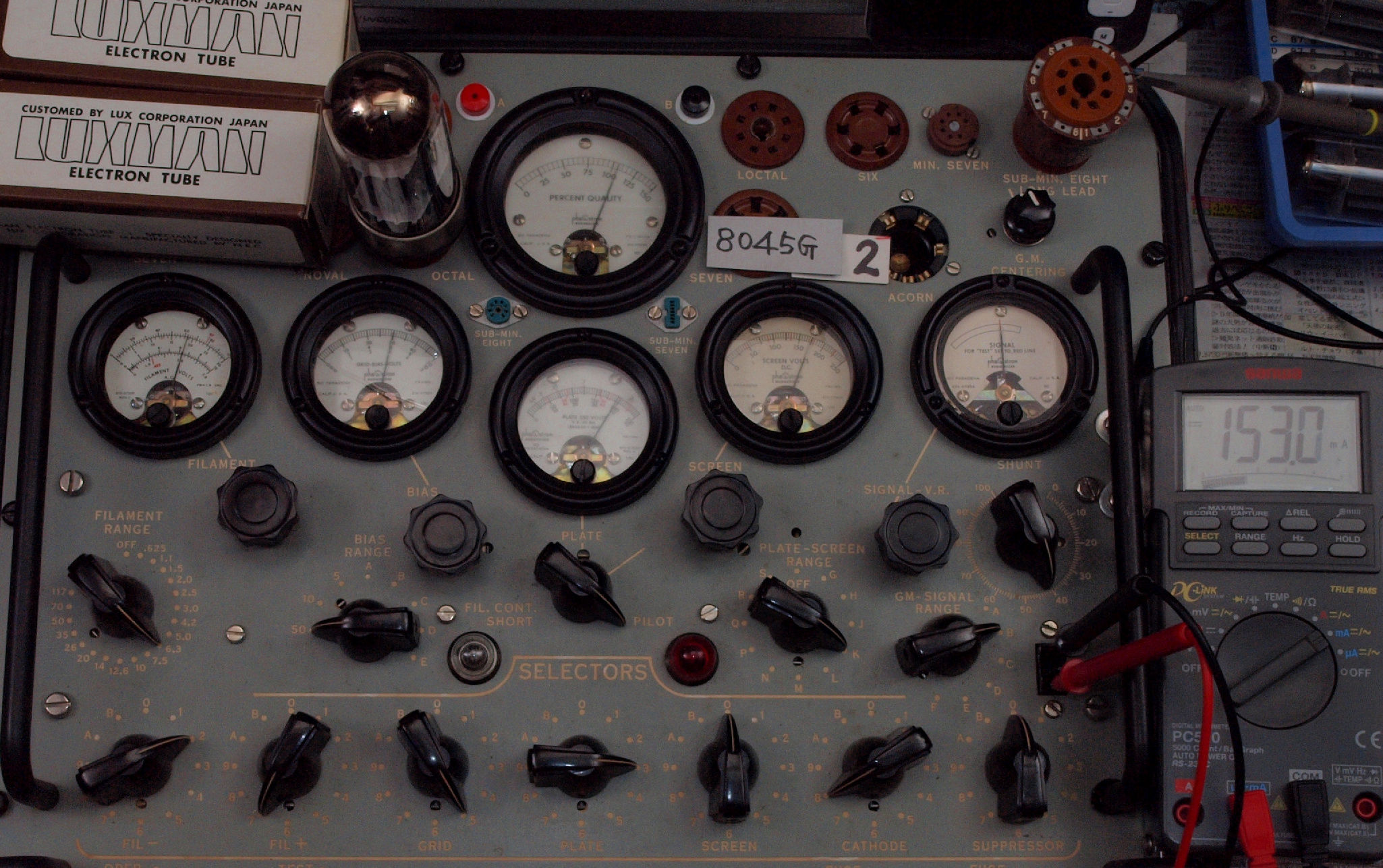 | V. TubeTester HickokTV−2B/Uによる予備真空管測定。 画像をクリックすると、大きく(横幅2050ドット)表示されます。 V0. 予備真空管 「8045G」。 左から1本目.2本目。 LUX8045Gの付属規格表から、 8045G相互コンダクタンス=11000μmho「Ep=200V、IP=120mA、Eg1=−30V」。 |