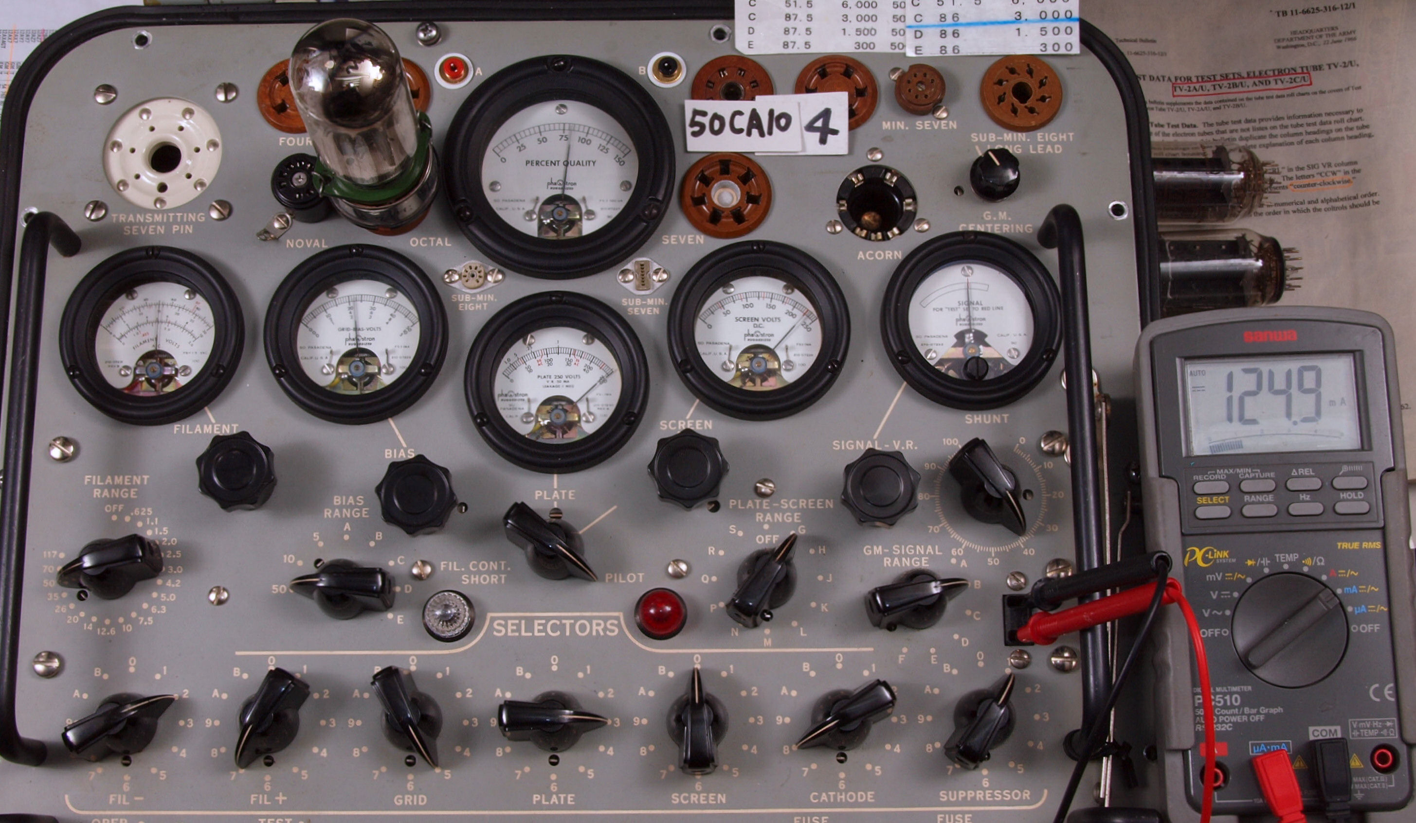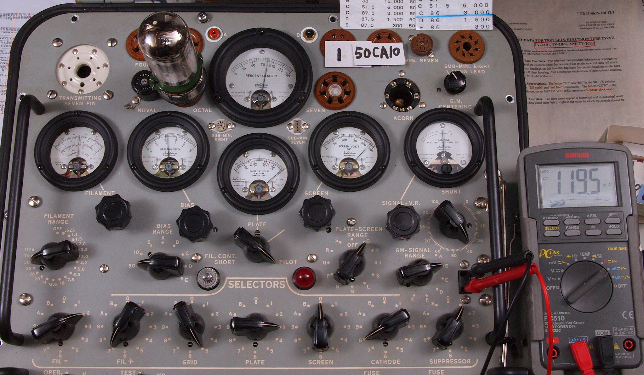 | U. TubeTester HickokTV−2B/Uによる付属真空管測定 。 U10. 付属真空管 50CA10。 左から1本目.2.3.4本目。 真空管ハンドブック(規格表)の、 50CA10相互コンダクタンス=12000μmho「Ep=250V、IP=95mA、Eg1=−22V」。 1965/1971全日本真空管マニュアル、1995オーディオ用真空管マニアルより。