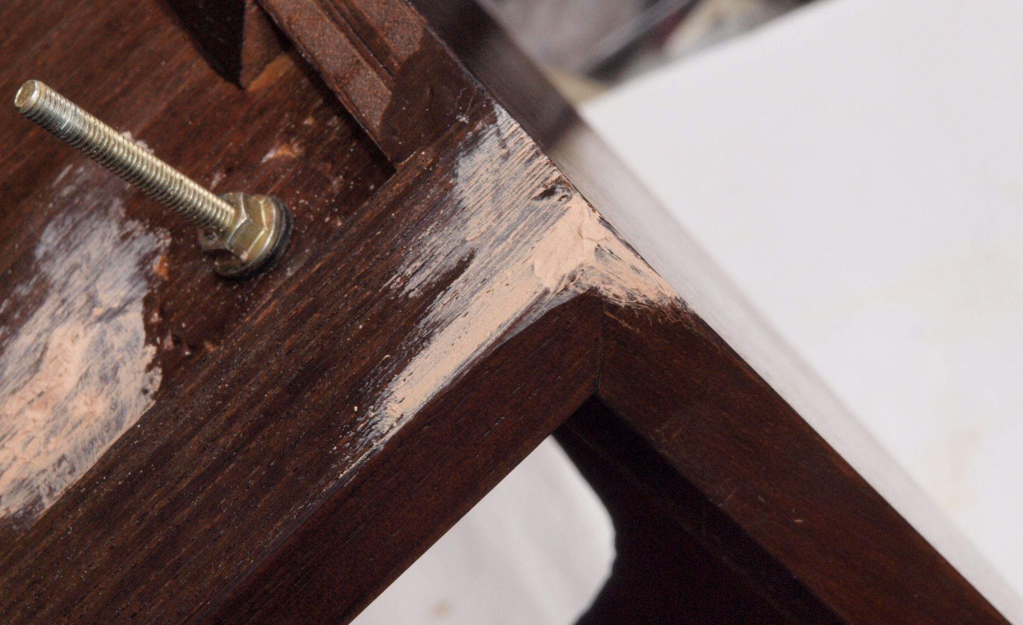 | K21. 修理前 足を取り、下から見る、ベニヤ(合板)の接着材が劣化し、木目方向に剥がれる。 |