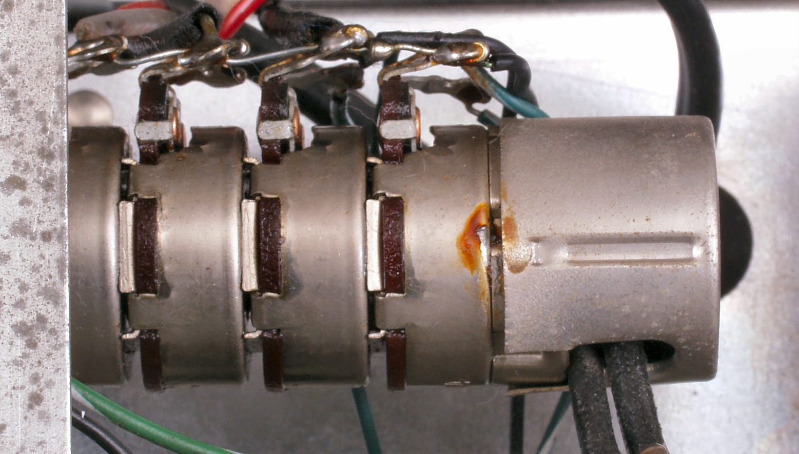 | C4A. 修理前 真空管MT9ピンソケット交換、ヒータ配線は、MTソケットのピンを割って線をはめ込んでいる |
