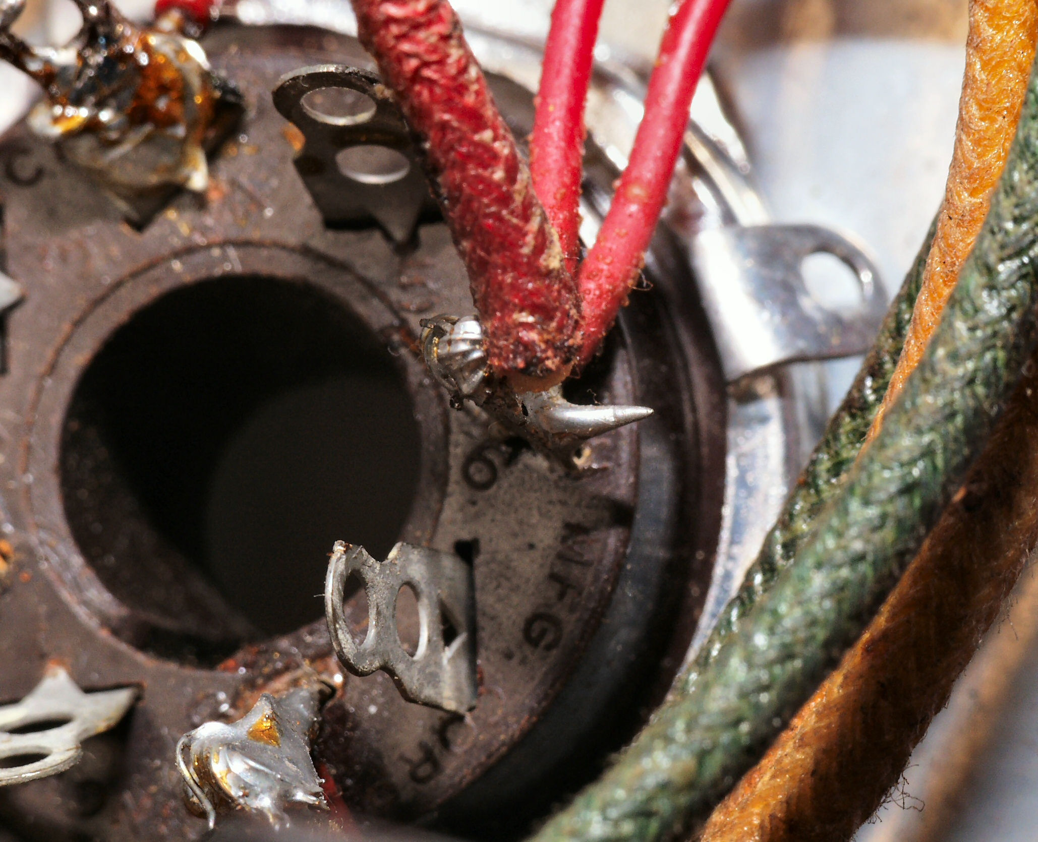 | C14. 修理前 ソケット回り配線、半田を取った所、これから絡み配線を取る |