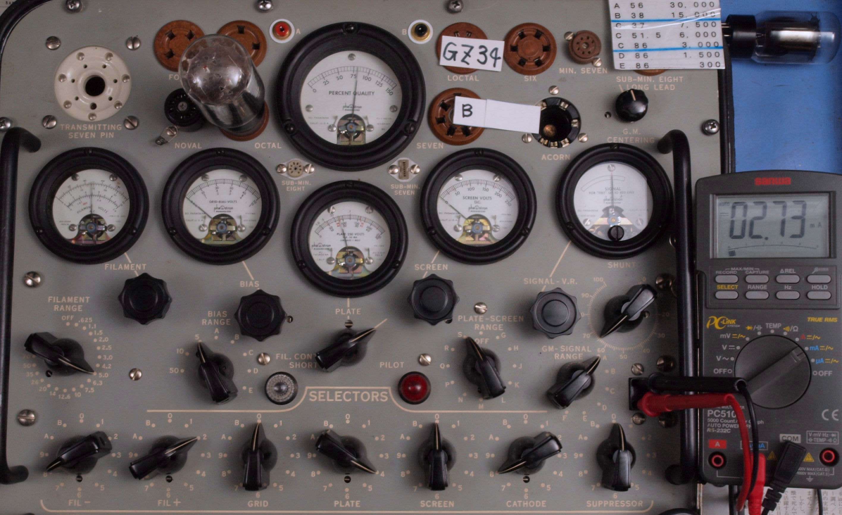 | U31. 付属「GZ34(5AR4)」ユニット1 エミション測定=80、Ip=2.73mA。 Vacuum Tube Tester Hickok TV-2B/U の「5U4」検査方法による、破棄値=75。 |