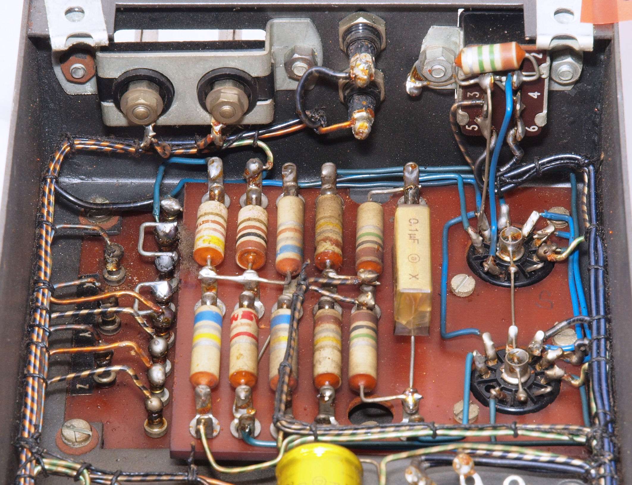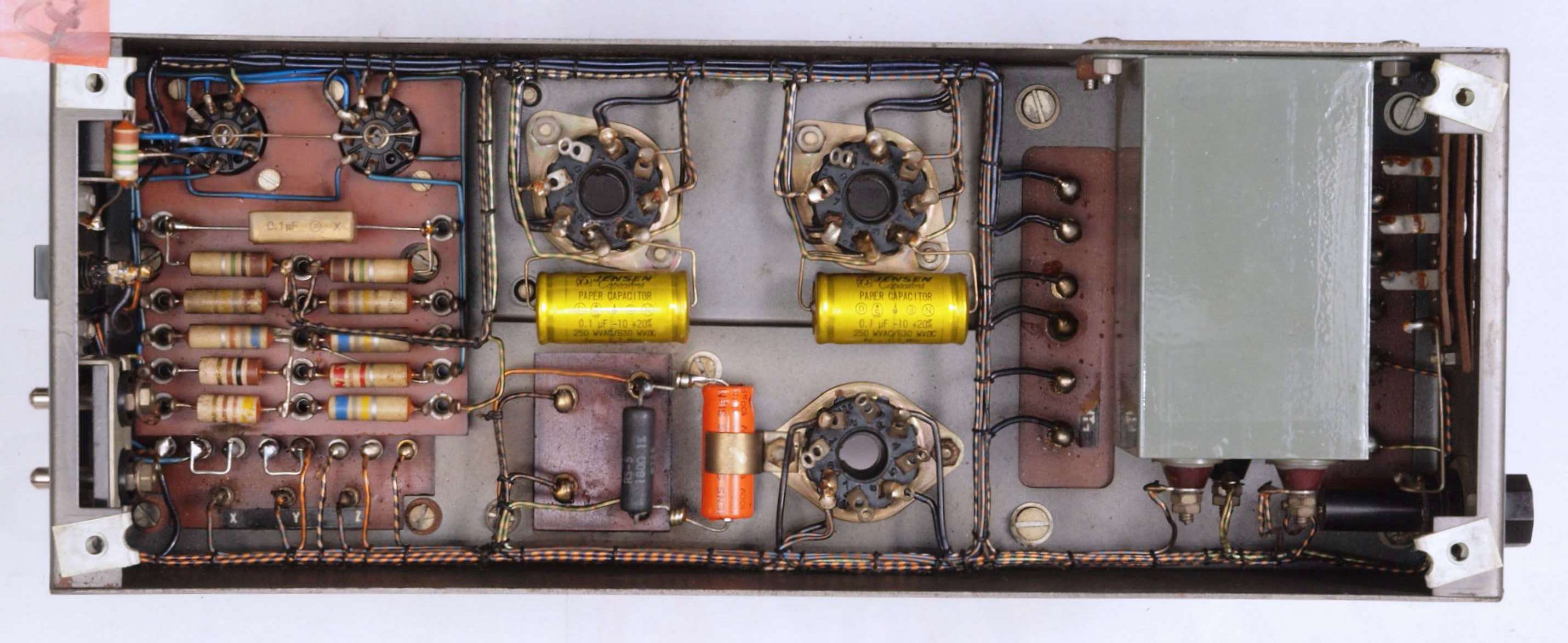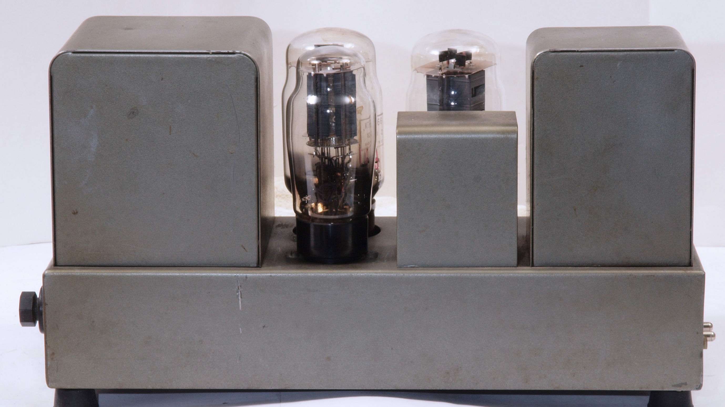 | U. TubeTester HickokTV−2B/Uによる付属真空管測定 。 真空管ハンドブック(規格表)の、 6267(EF86)相互コンダクタンス=2000μmho「Ep=250V、Ip=3mA、Esg=140V、Eg1=−2V」。 KT66相互コンダクタンス=6300μmho「Ep=250V、Esg=250V、Ip=85mA、Eg1=−15V」。 1960/1962/1964/1966ナショナル真空管ハンドブック、1995オーディオ用真空管マニアル、60/62/69東芝電子管ハンドブック、1962日立電子管ハンドブック、1965/1971全日本真空管マニュアル、RC15/19/26/27/28/29/30 Receiving Tube Manual、1966/実用真空管ハンドブック、1995世界の真空管カタログより。 5GK4(5AR45)エミション測定=VacuumTubeTester Hickok TV-2B/U の「5U4」検査方法による、破棄値=75。 |