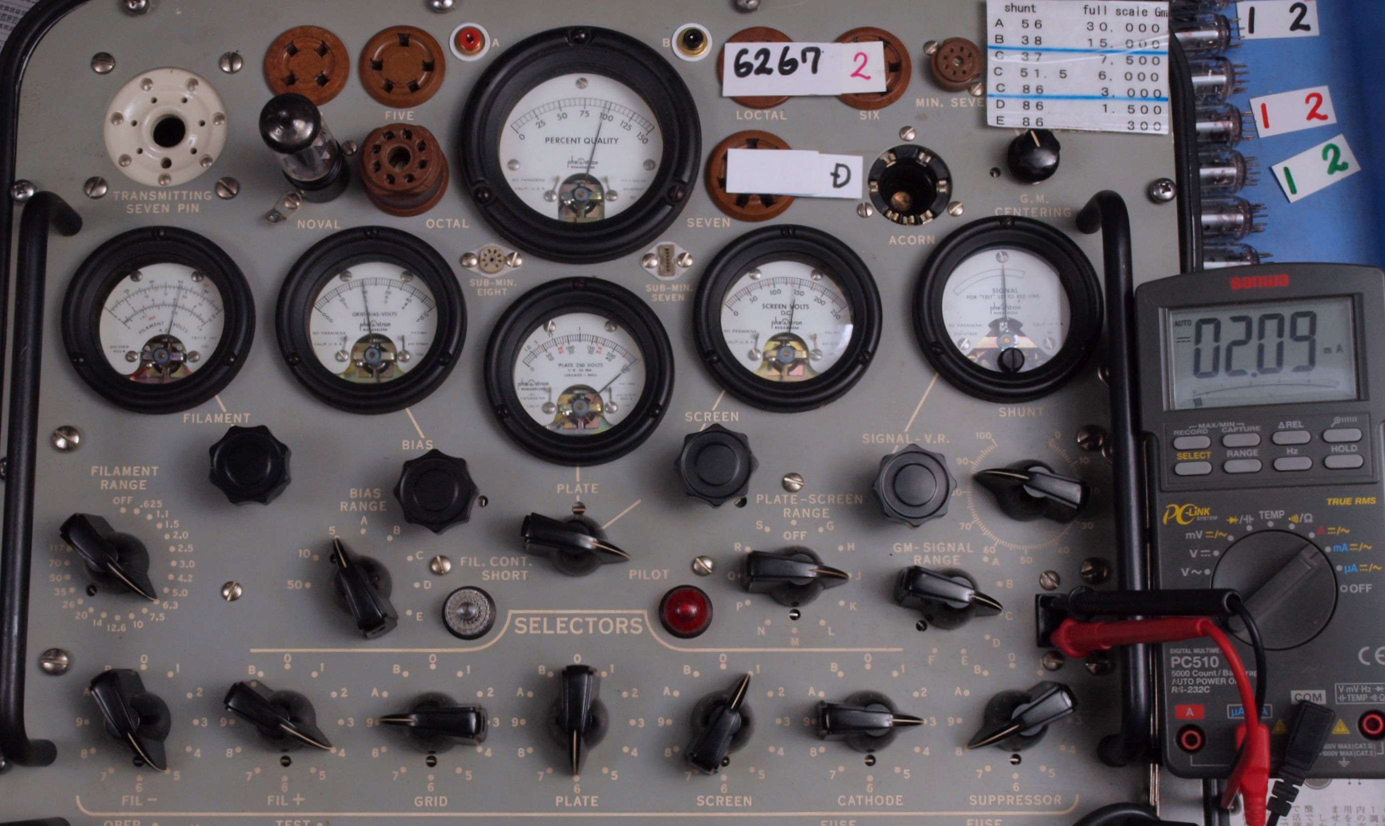 | U12. 付属2本目「6267」。 Gm測定=1900μmho、IP=2.09mA。 Cレンジ=3000μmhoレンジでの測定、「Ep=250V、Esg=150V、Eg1=−2V」 |