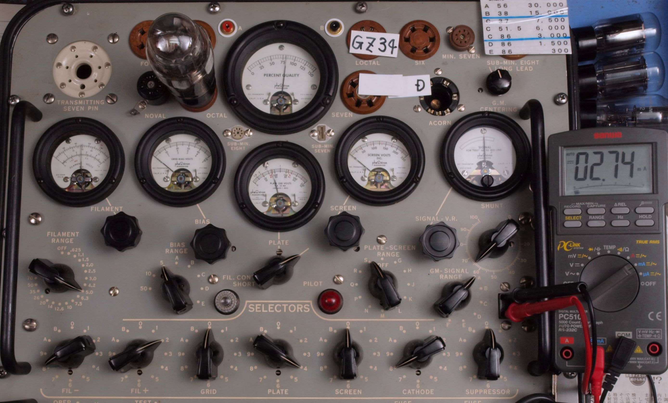 | U31. 付属「GZ34(5AR4)」ユニット1 エミション測定=80、Ip=2.74mA。 Vacuum Tube Tester Hickok TV-2B/U の「5U4」検査方法による、破棄値=75。 |